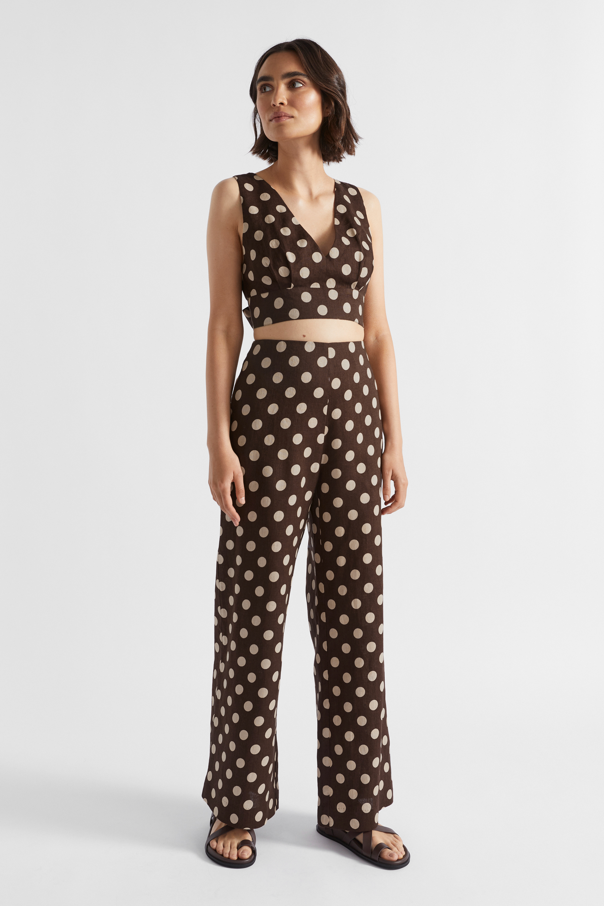Crafted from premium French linen, this bodice top is a holiday essential. It features a deep V neck and ties at the rear with a bow. Pair with the matching wide-leg trousers or shorts.