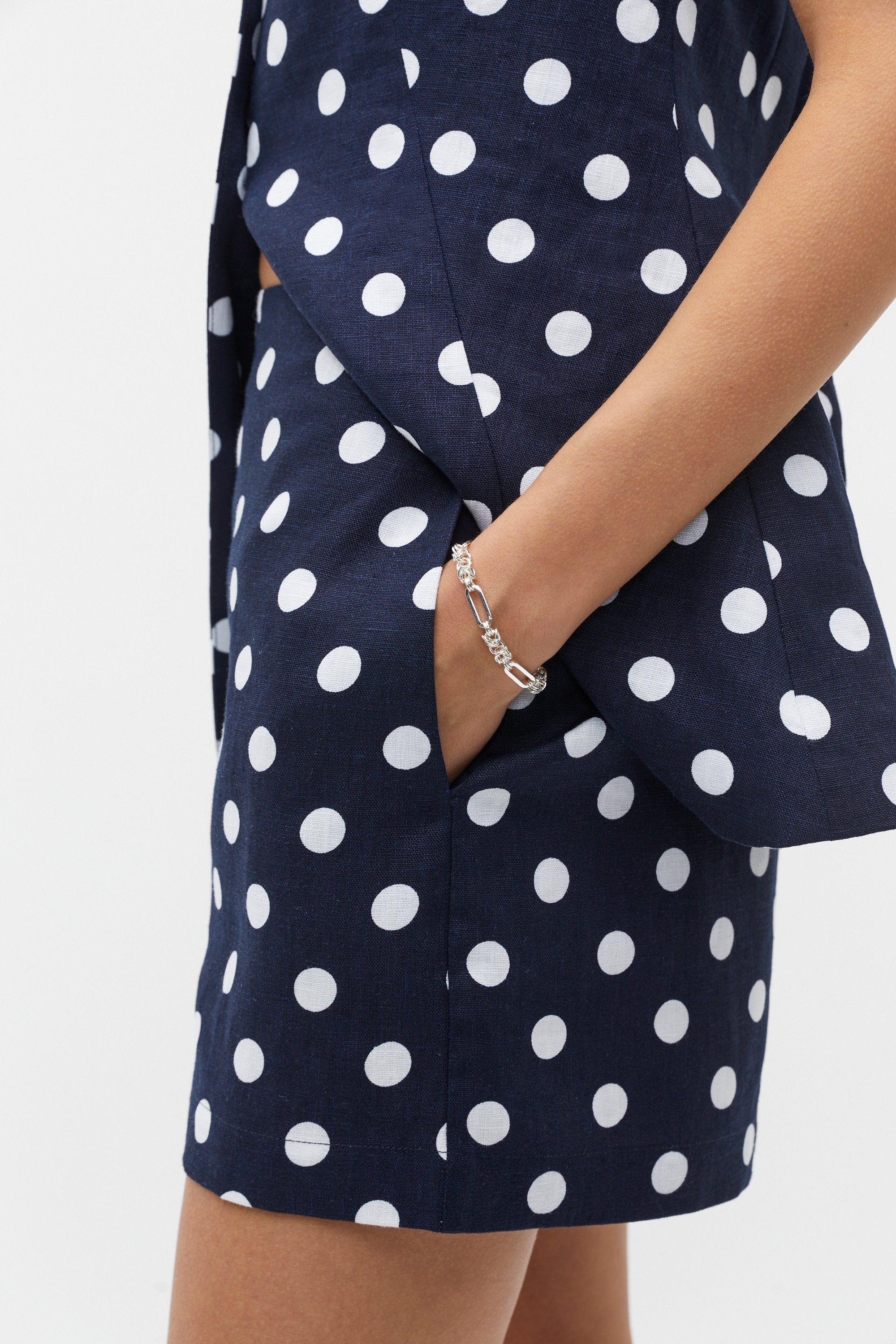 Crafted in premium linen, these shorts are set to be your new summer go-to. They feature a fixed waistline with a rear zip, pockets and a mini length in a playful polka dot print. Style with the matching polka dot styles for a coordinated head-to-toe look.