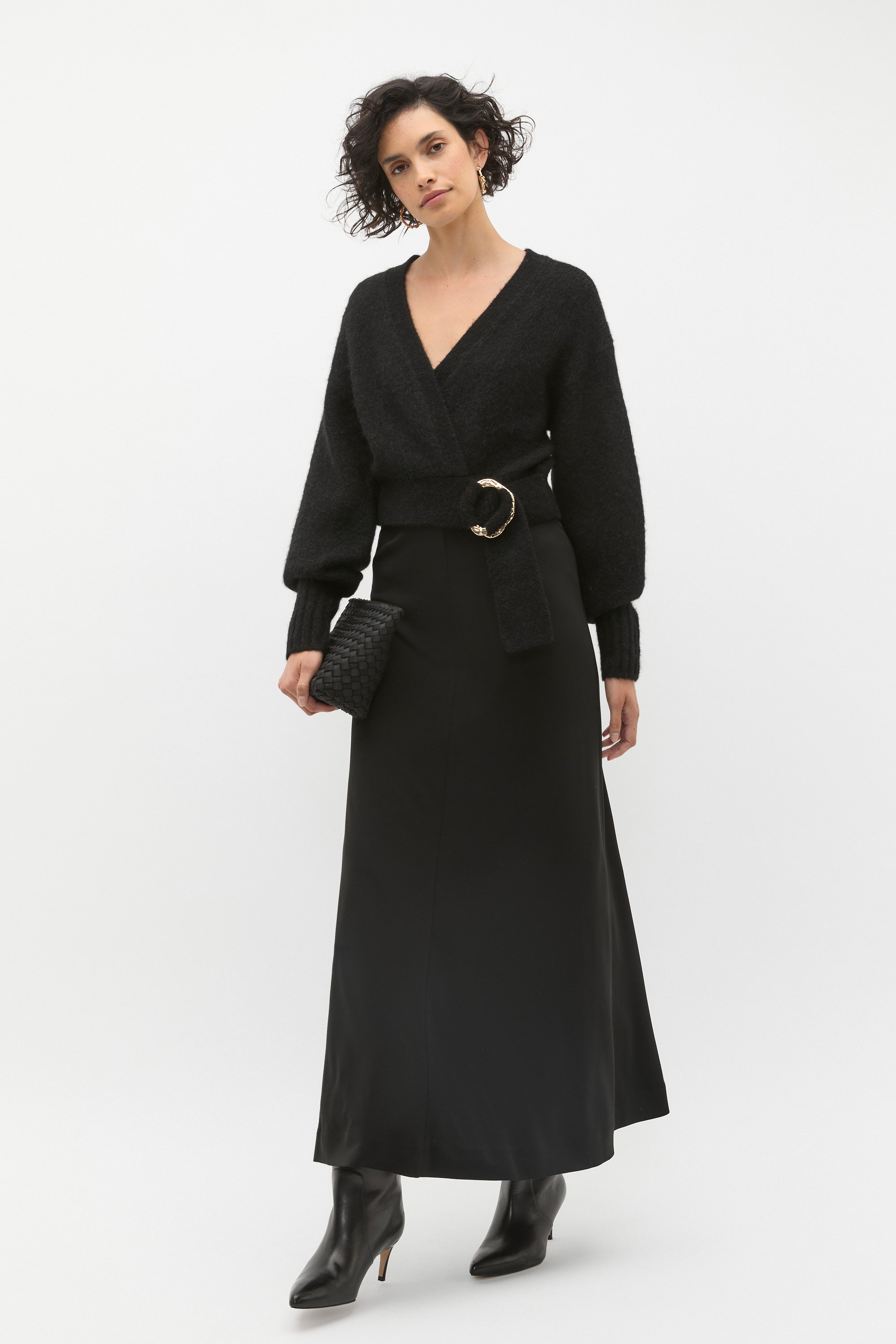 Update your winter wardrobe with this chic knit jumper, complete with a wrap front and a gold buckle with a textural effect. It features a drop shoulder, long sleeves with elasticated cuffs and is crafted in a thick, soft blend.