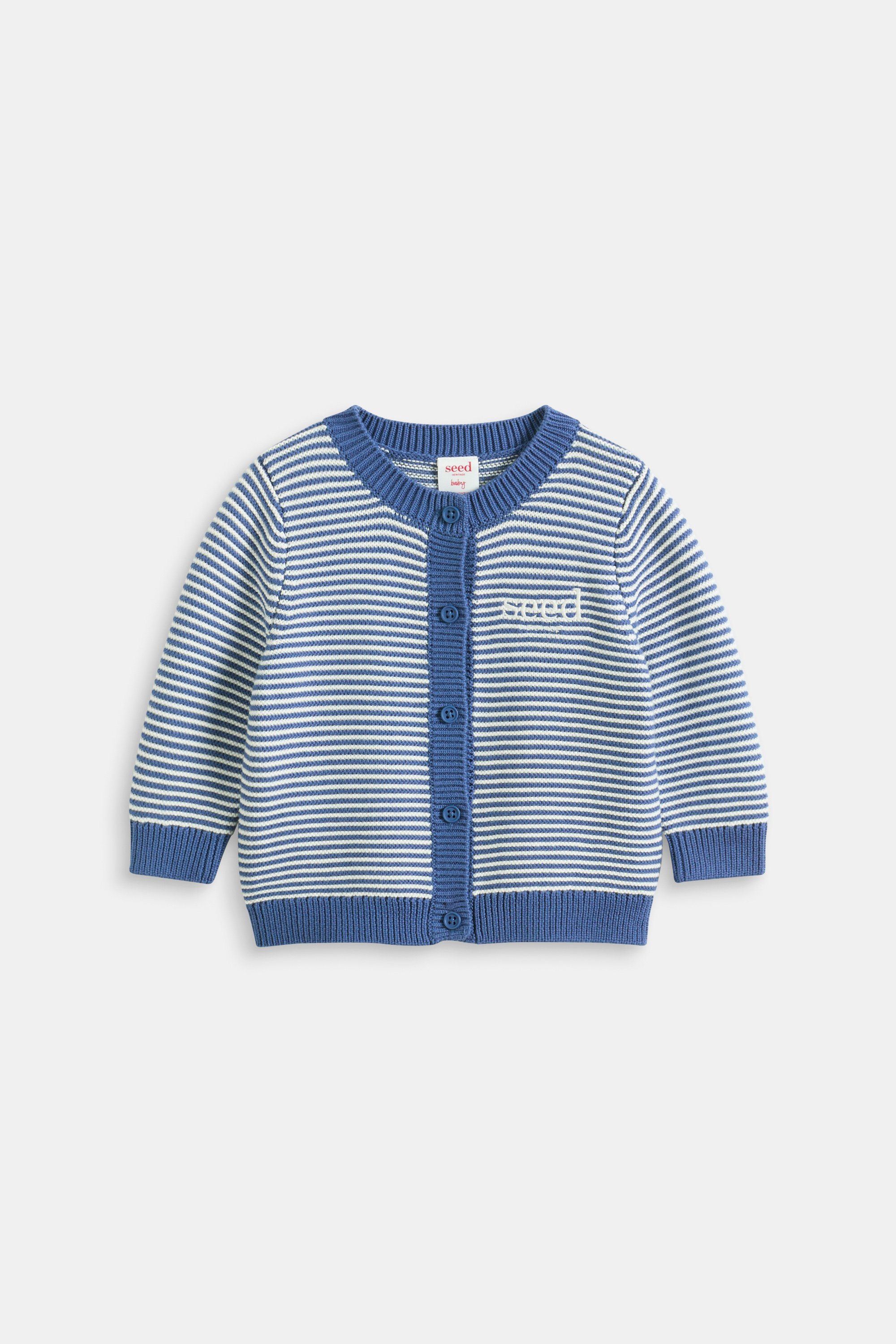 A classic design with timeless appeal, this adorable little cardigan is an absolute essential. Crafted in premium cotton with a soft knit finish, it features a round neck, long sleeves, a stripe design and an embroidered Seed Heritage logo.