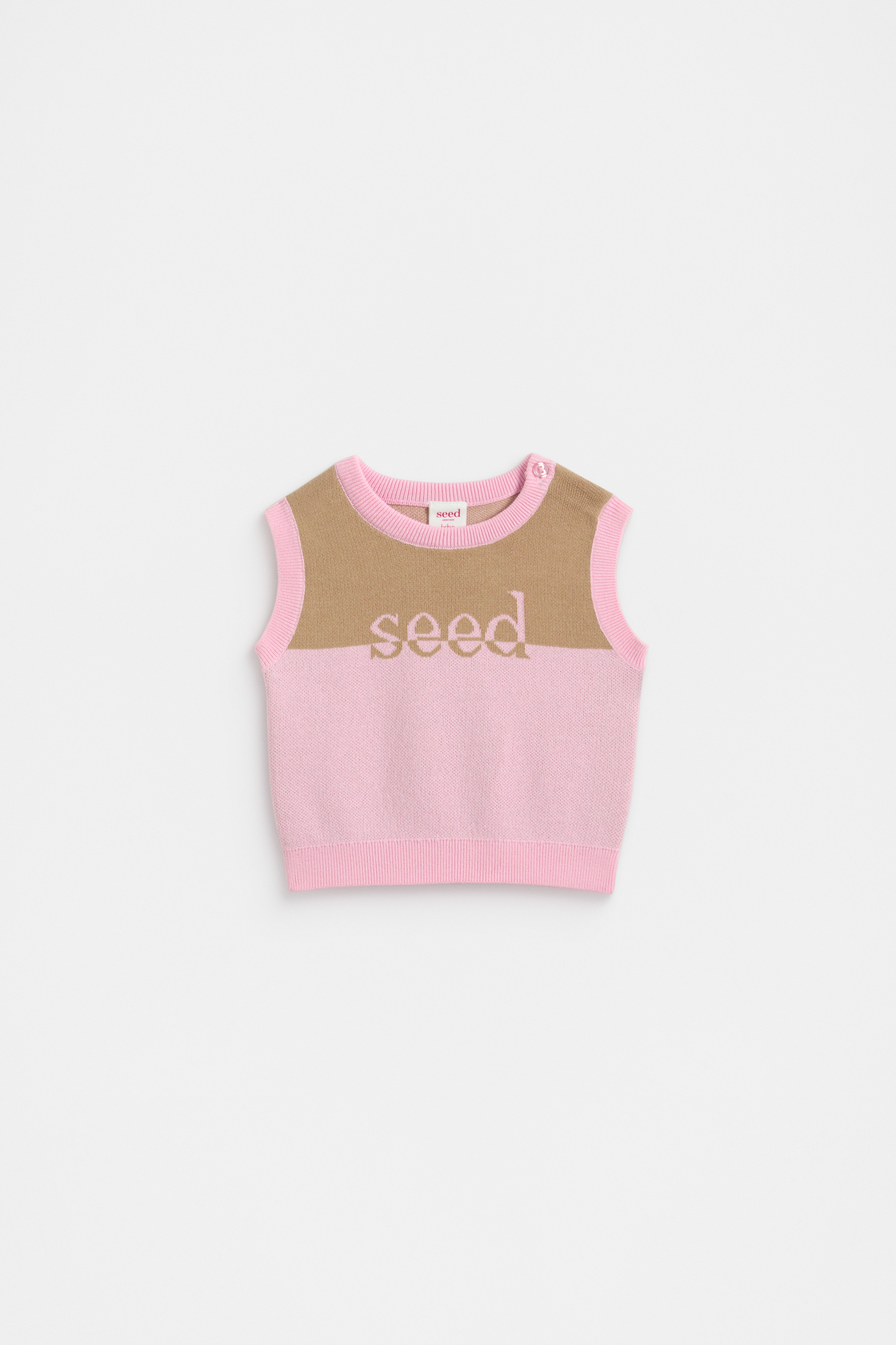 Complete their winter wardrobe with this soft knitted vest, designed to keep your little love cosy. Crafted in premium cotton, it's a sleeveless style and features a round neck, a splice colour design and a Seed Heritage logo.