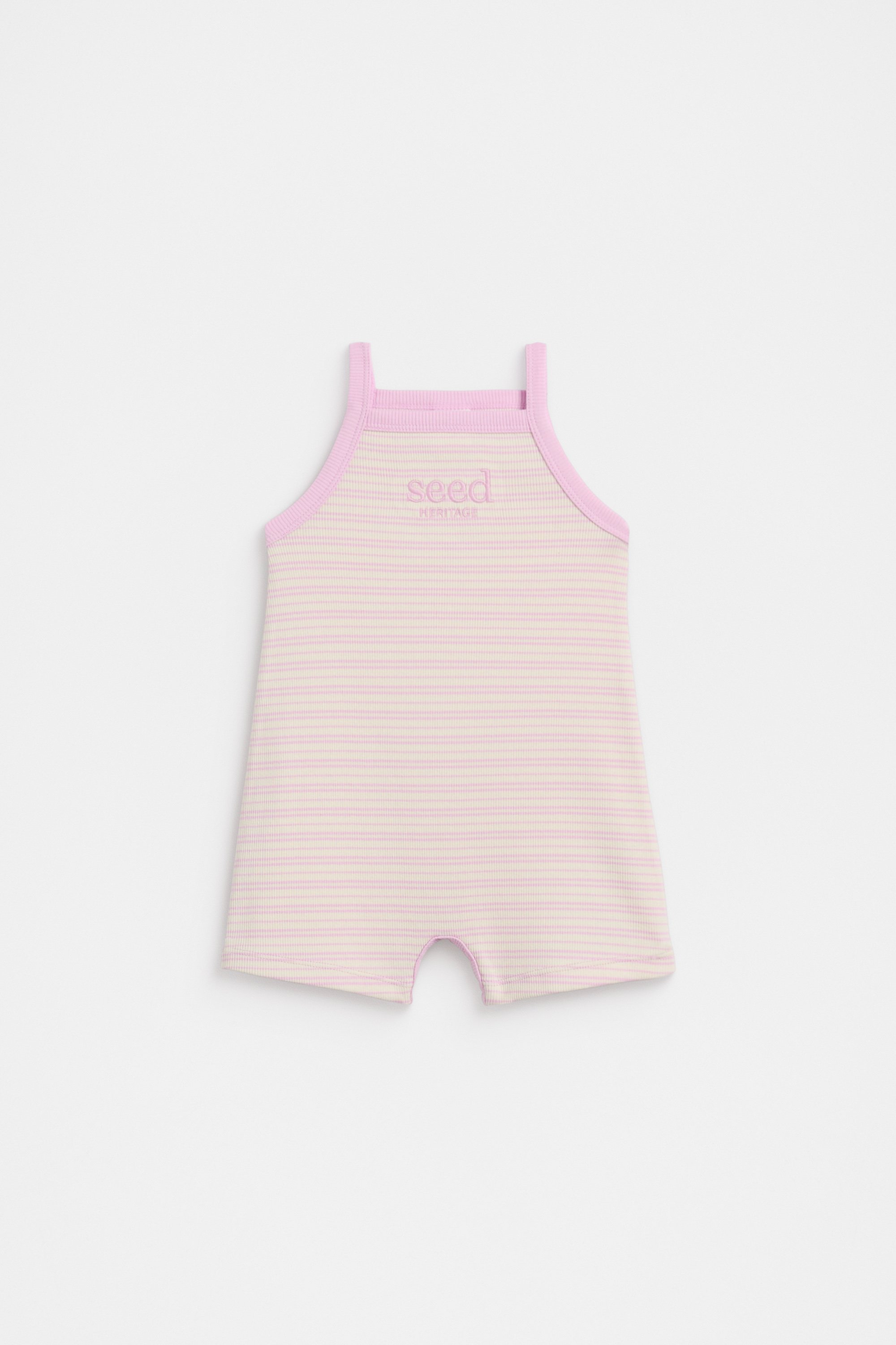Perfectly lightweight for summer, this little romper has just the right amount of stretch. Crafted in a premium stretch cotton blend, it features a straight neck, slim straps, a stripe design and an embroidered Seed Heritage logo. It secures with snaps at the gusset.