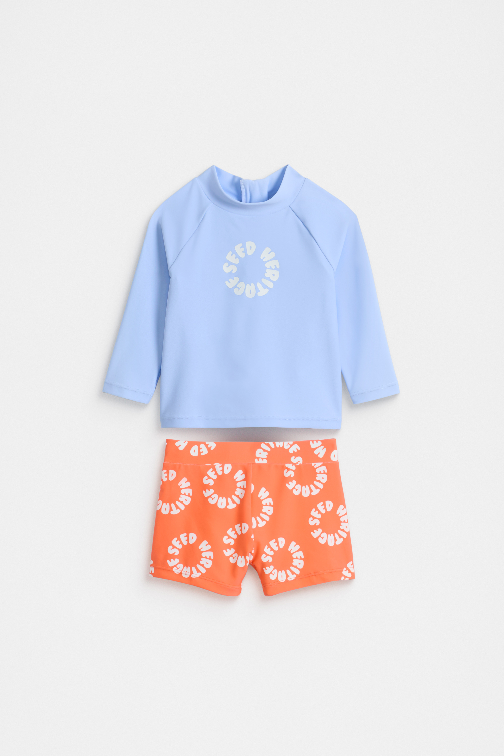 Your smallest family member will be swim-day ready with this too-cute set, including a rash vest and swimming shorts. This set features a Seed Heritage logo design and has plenty of stretch for easy wear.