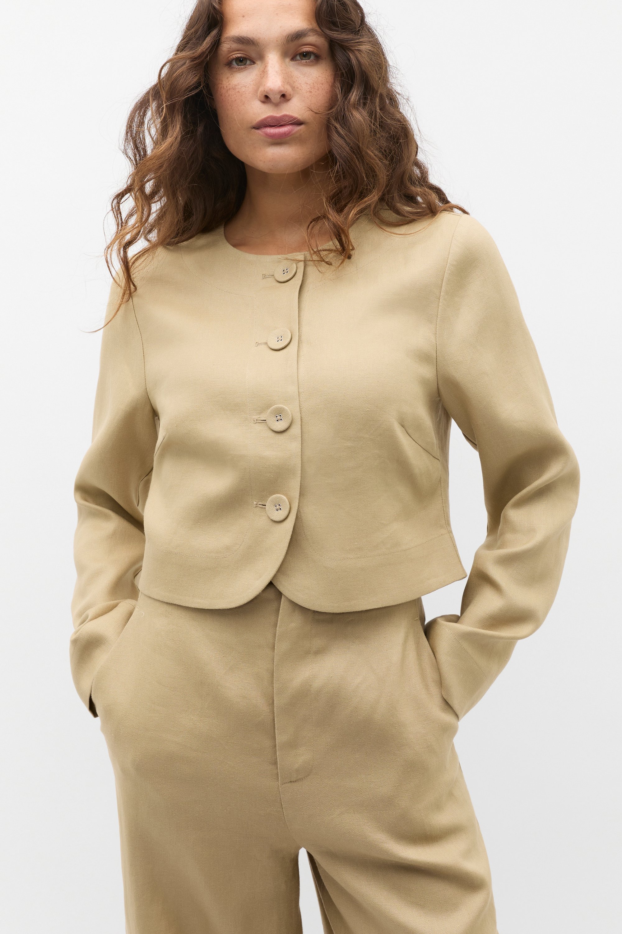Designed with endless versatiliy in mind, this long sleeve style is a must-have for your wardrobe refresh. Crafted in premium linen, it features a round neck, long sleeves and a button front. It also has a curved hem detail for a fashion-forward finish. Style with our coordinating linen pieces for the perfect holiday-ready set.