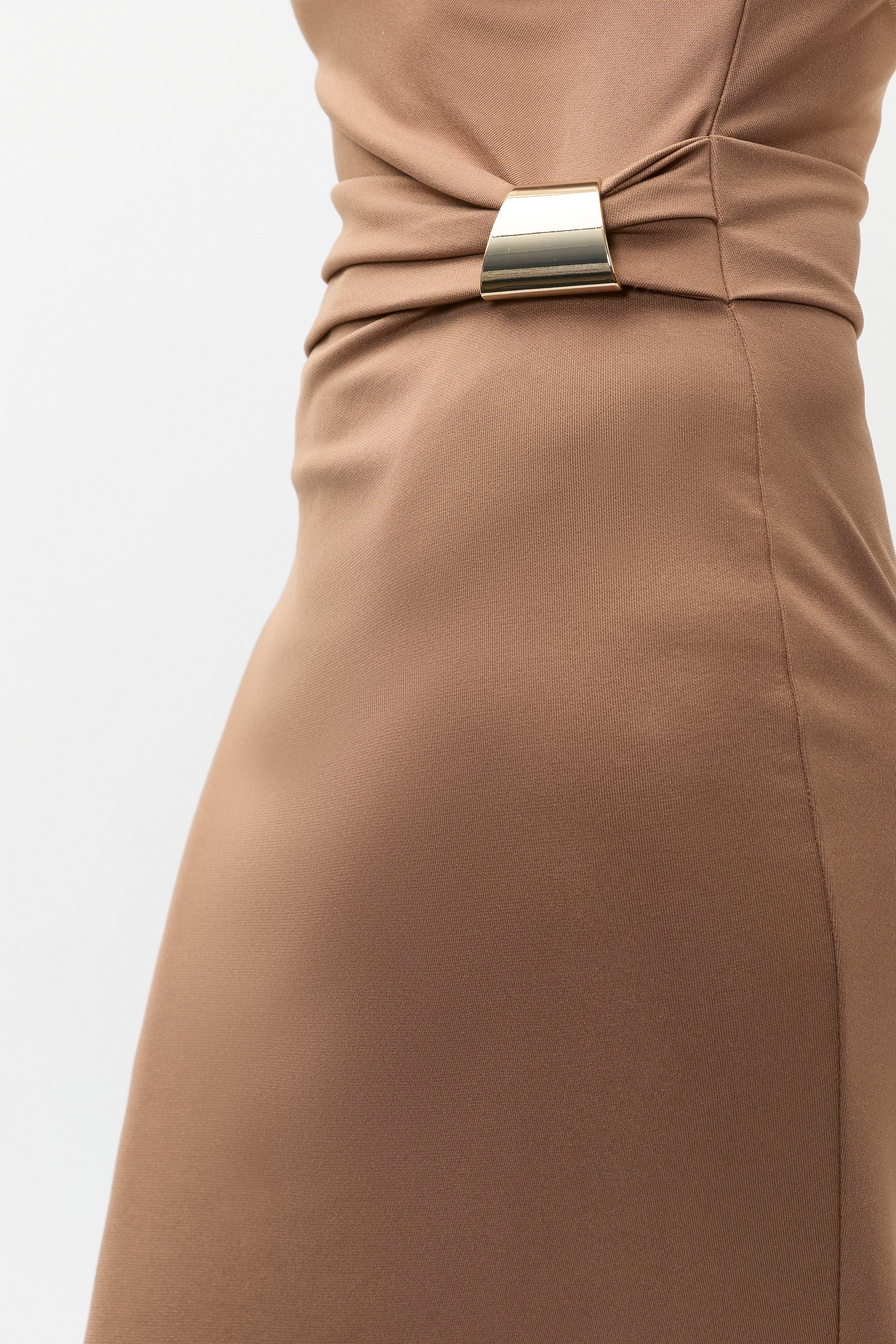 Ready for your next evening event, this dress has a sleek finish and elegant details. Smooth and stretchy, it features a round neck, long sleeves and has gathered details pulled together with a gold ring at the waist. It secures with an invisible zip at the rear.