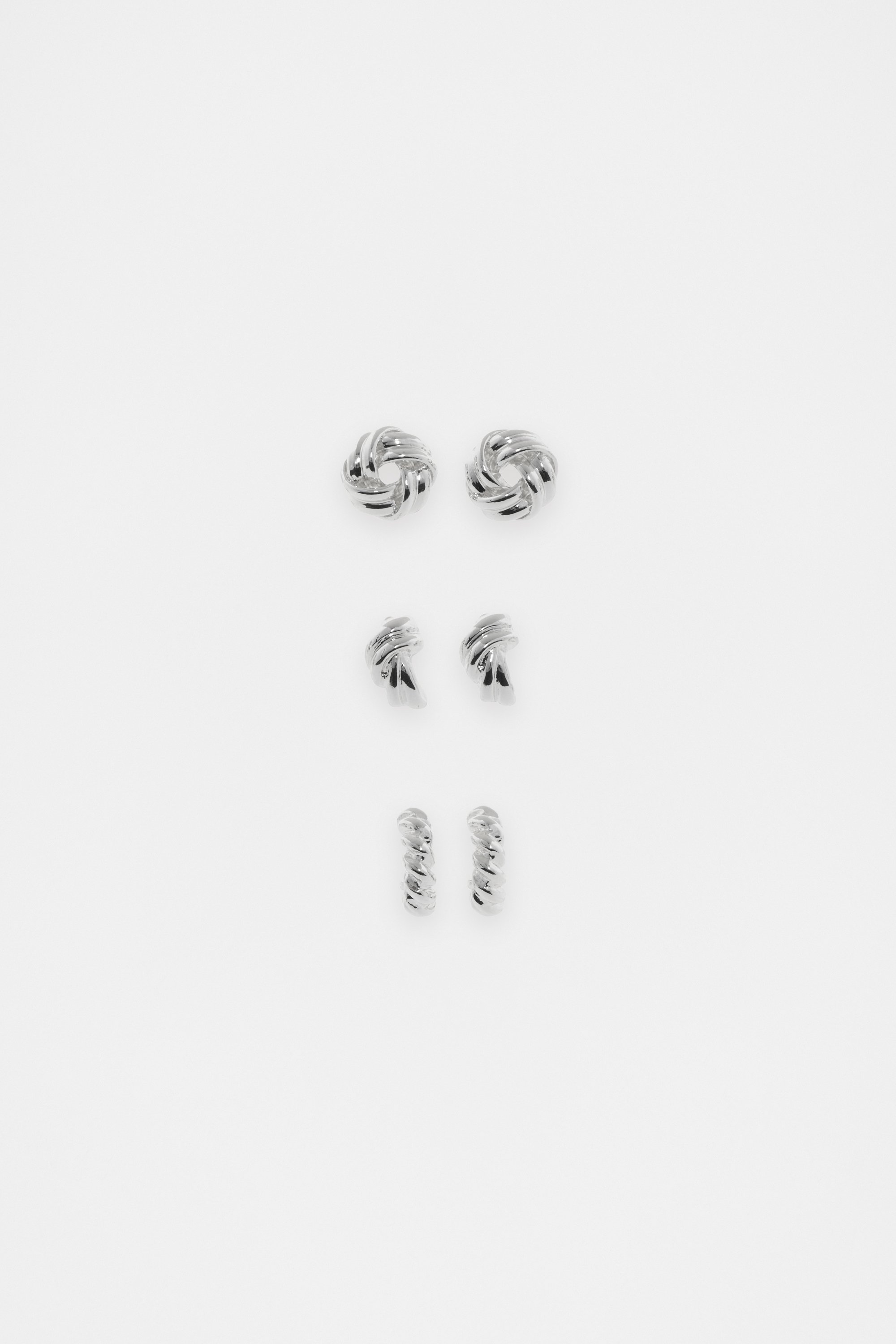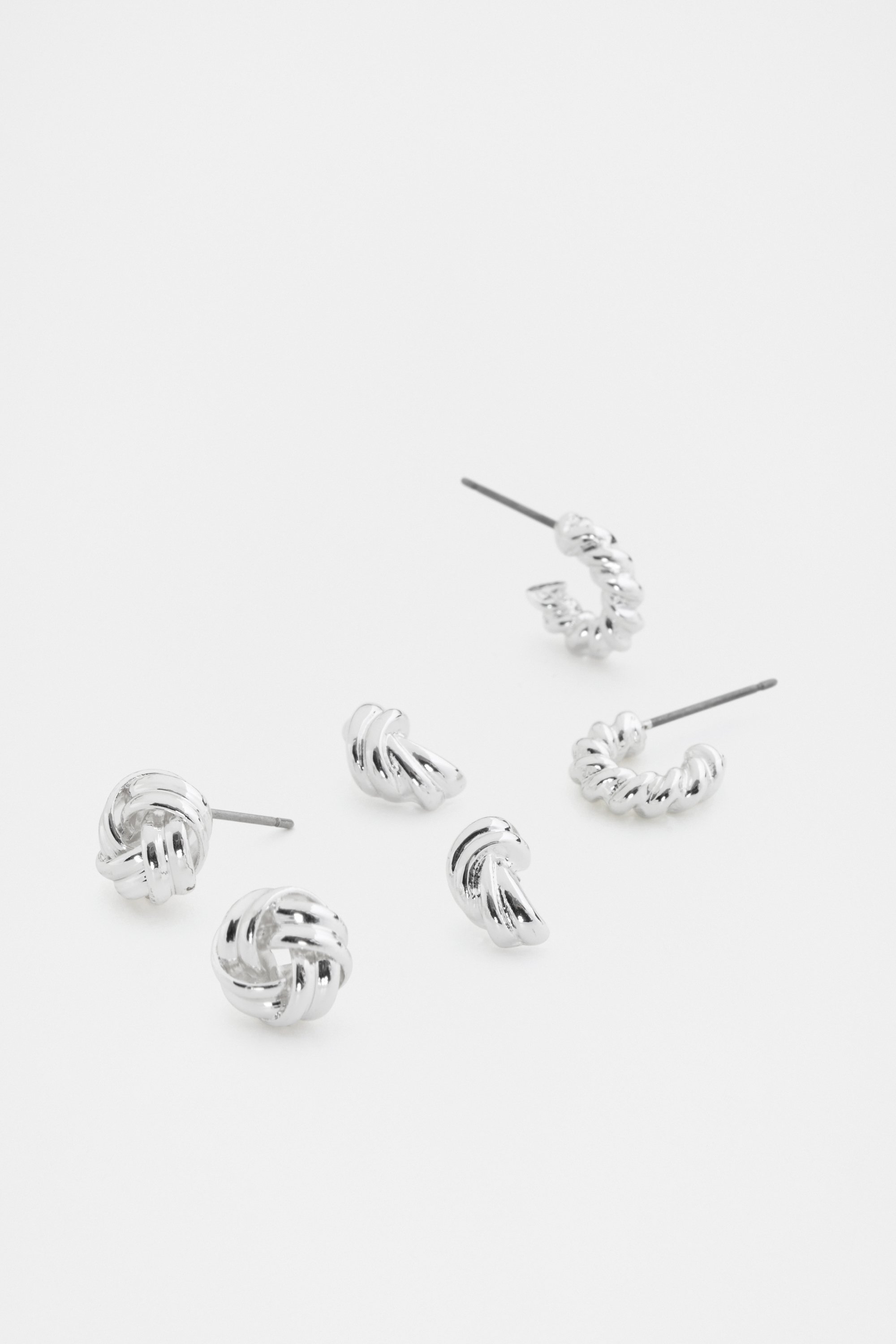 With three different styles for versatile stacking, this pack is the perfect addition to your earring collection. This pack features one pair of hoops and two pairs of studs with interlooped features. Available in both silver or gold to suit any wardrobe, designed to match our coordinating pieces.