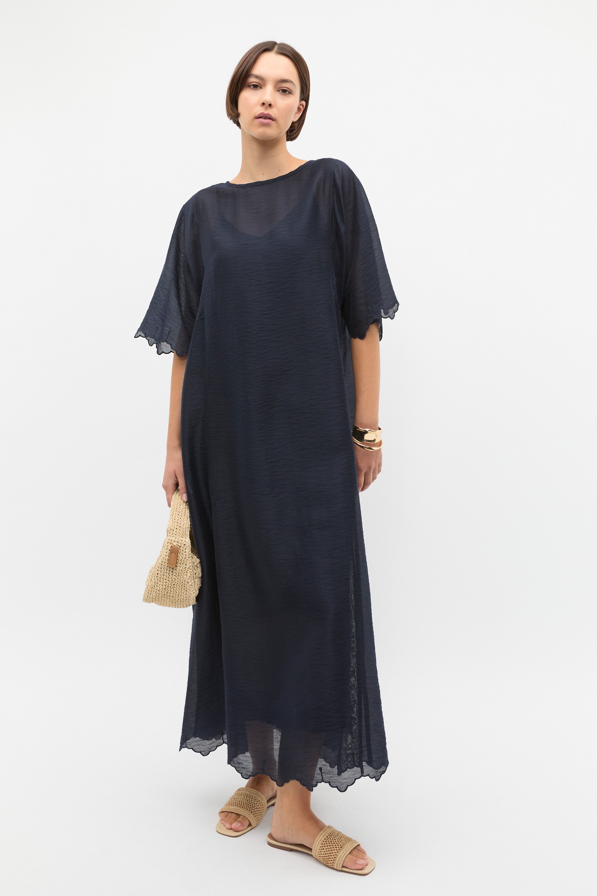 Perfect for your summer wardrobe, this dress includes a slip and a subtly sheer kaftan layer. Crafted in a lightweight blend, it has a round neck, short sleeves, a scallop trim detail and falls to a maxi length with a relaxed, loose-fitting shape. Secures with a button at the back of the neck.