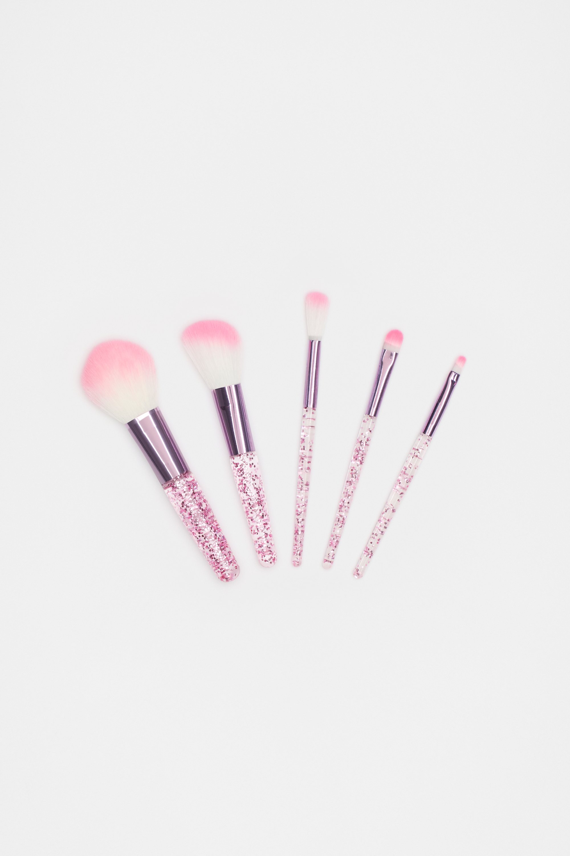 Colourful and handy, this brush set meets all her make up needs. It features five make-up brushes with a sparkly handle and an ombre feature. These brushes come in a cute reuseable bag, ideal for travel. This product is not a toy and is not suitable for children three years and under.