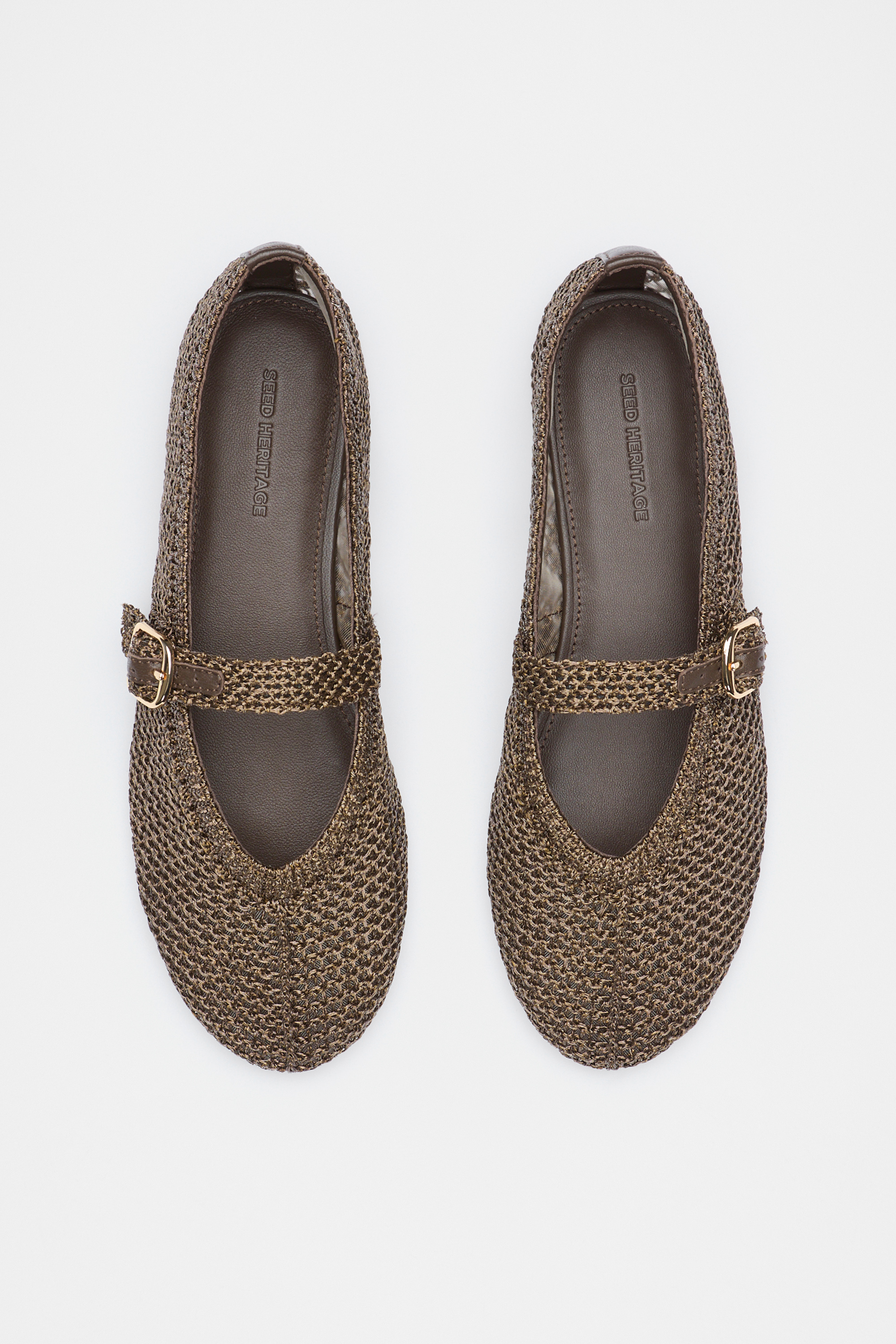 With a textured finish, these ballet flats add a contemporary edge to your look. They feature a crochet upper and a Mary Jane style strap detailed with soft gold hardware.