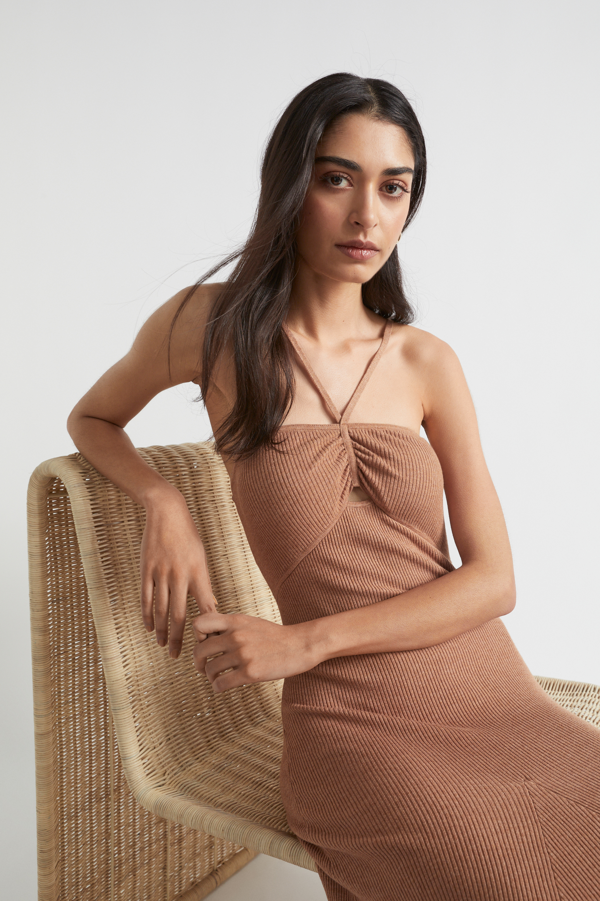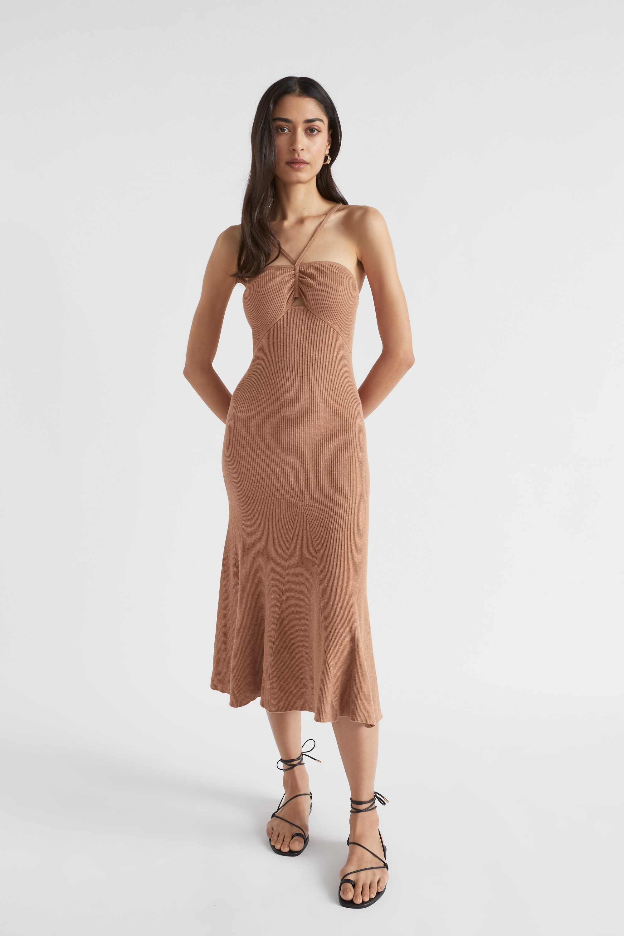 With angled halter straps and gathering at the bust, this dress has a retro feel. It is crafted from a ribbed knit fabric, falling in a fluted skirt to a midi length.