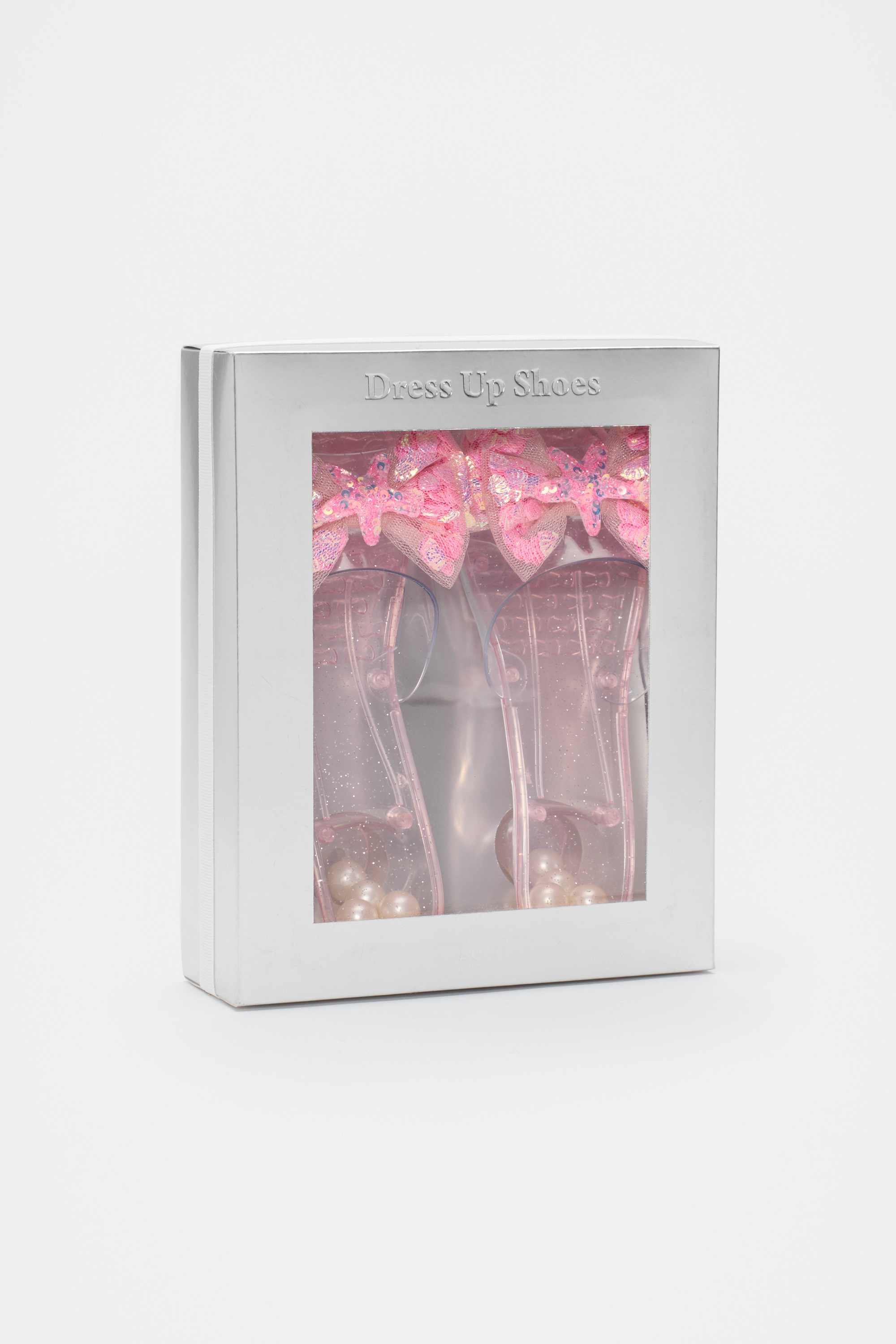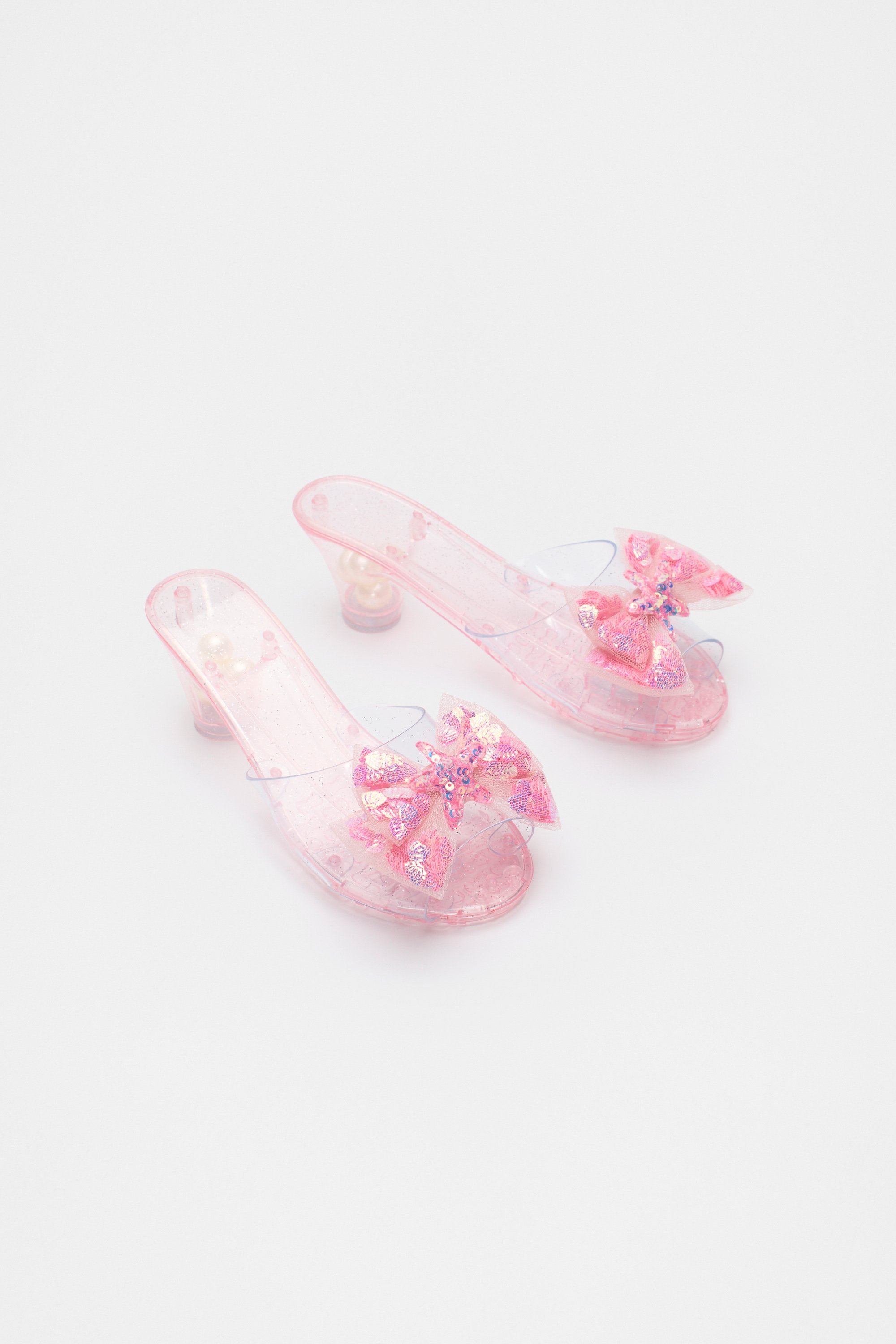 She'll love dressing up with these sparkly mermaid shoes. They feature small bead-filled heels, a tulle bow decorated with sequins and are designed to match our mermaid dress up costume. This product is not a toy and is not suitable for children three years and under.
