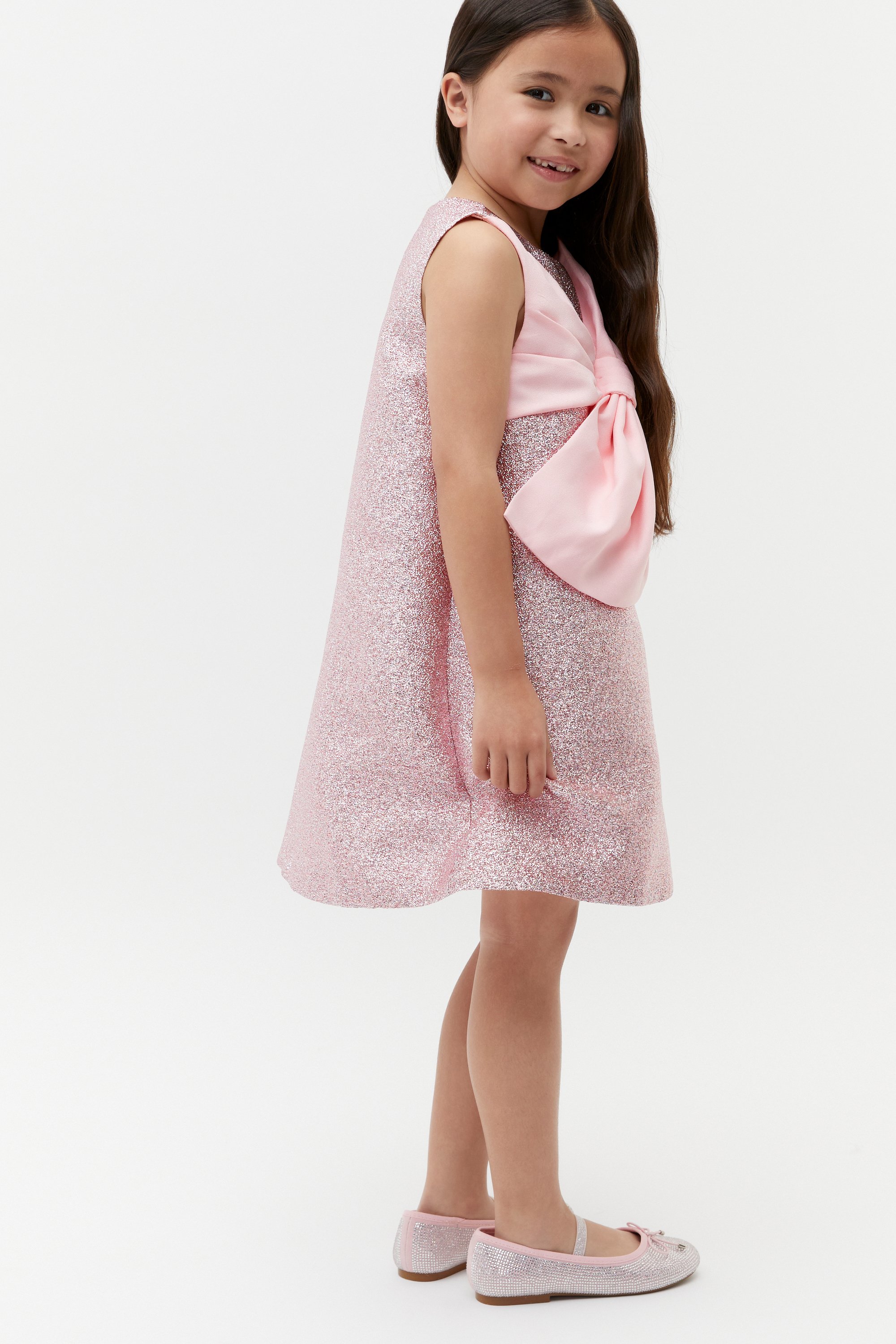 Perfect for her next special occasion, this dress features a statement metallic finish and a bow motif at the front. It's a sleeveless style with a round neck, and is lined for all-day comfort.