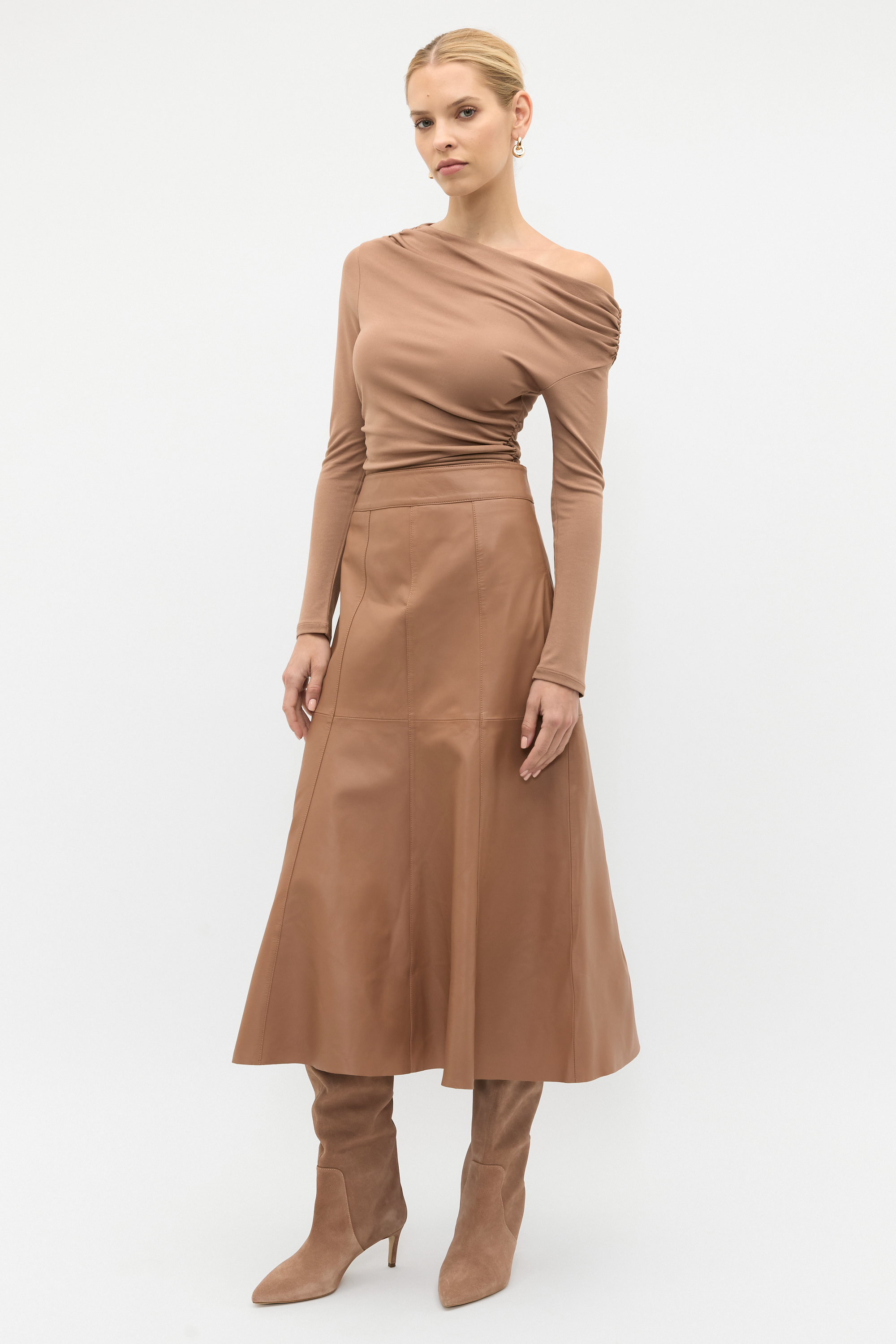 This chic top offers an elevated moment to your evening wardrobe. The micro jersey blend offers a smooth and stretchy finish, perfect to dress up your look. It features a statement off shoulder design with long sleeves and rouched details around the waist.