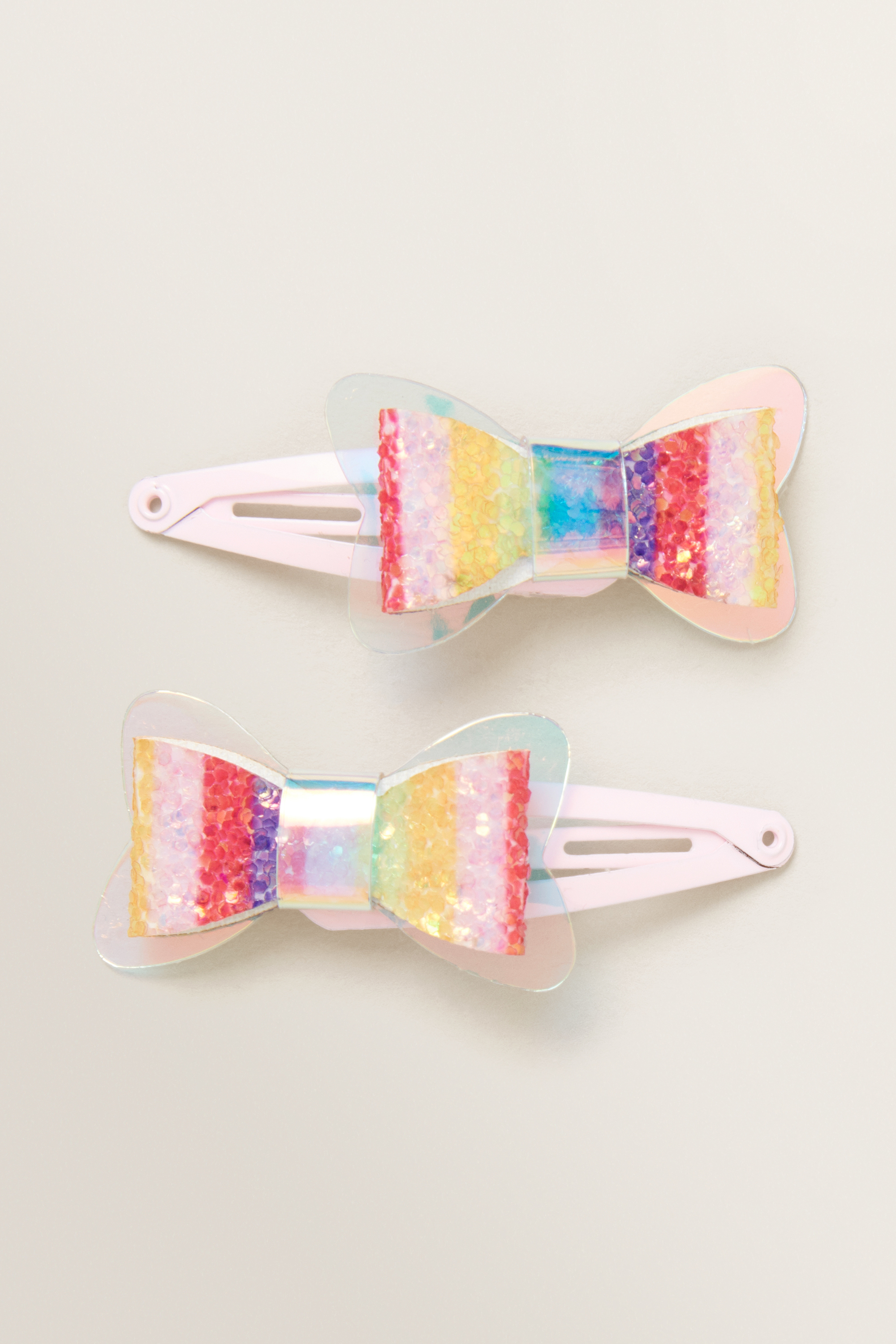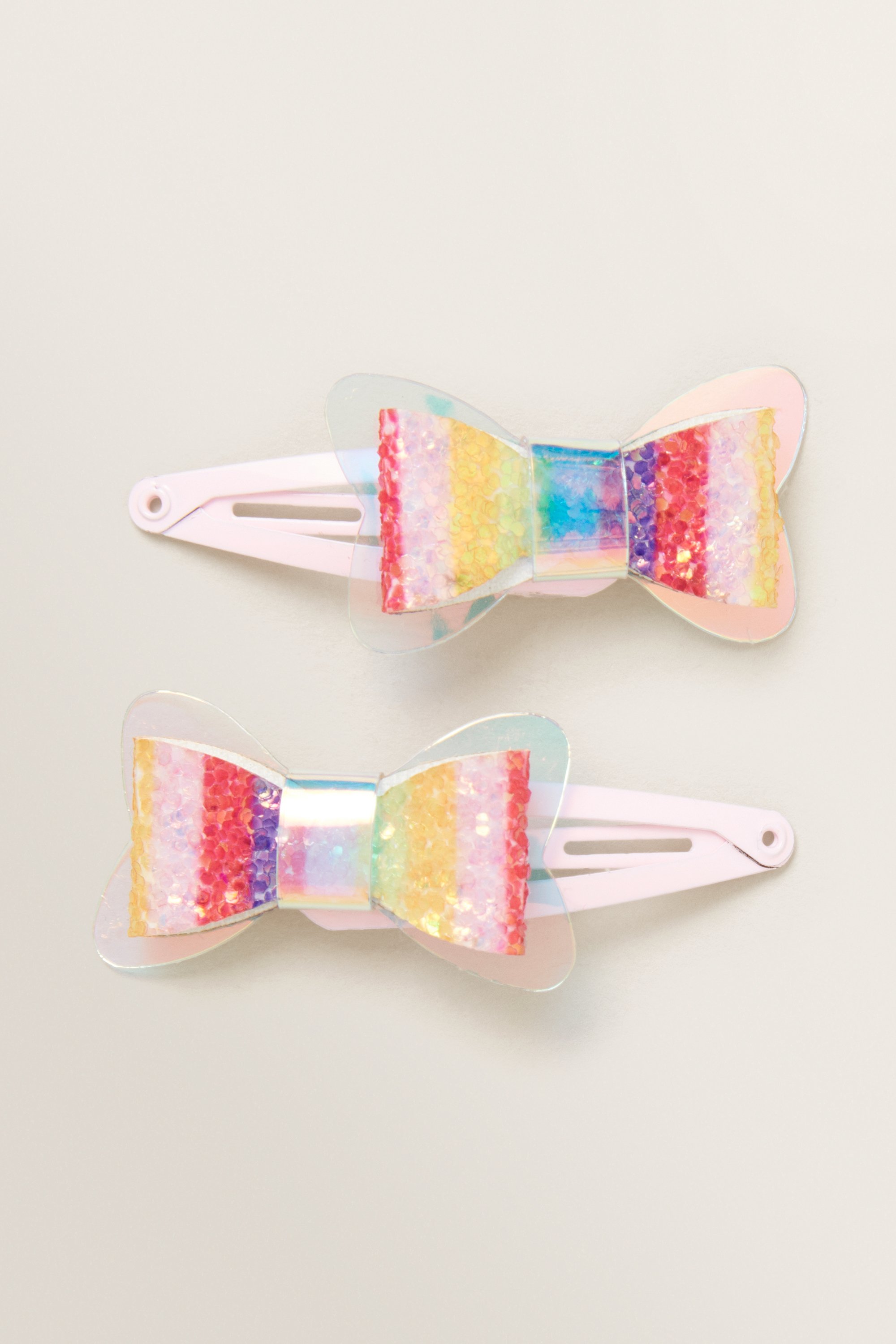 Featuring a rainbow pattern, this Mini Bow Pair features beaded detailing and secure snap closures.