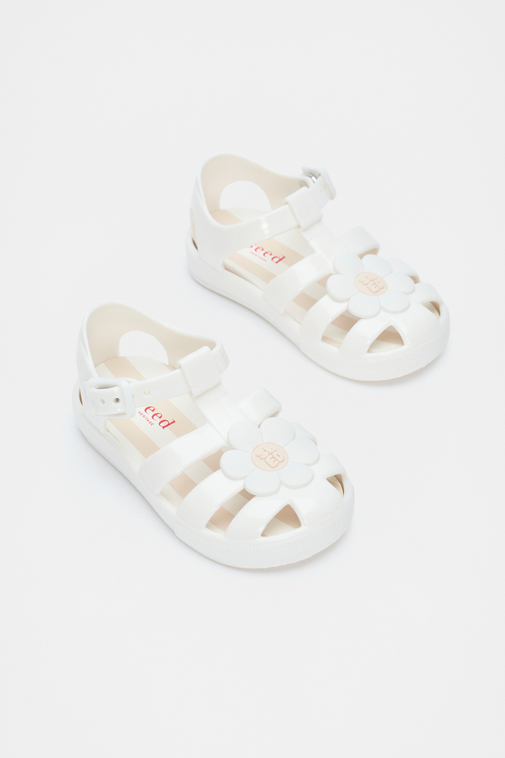 These classic jelly sandals are the sweetest style for her everyday adventuring. They are splash proof and have a removable cushioned inner sole. They feature a caged design with adjustable press stud buckle closure and custom daisy motive. They come in a handy mesh carry case.