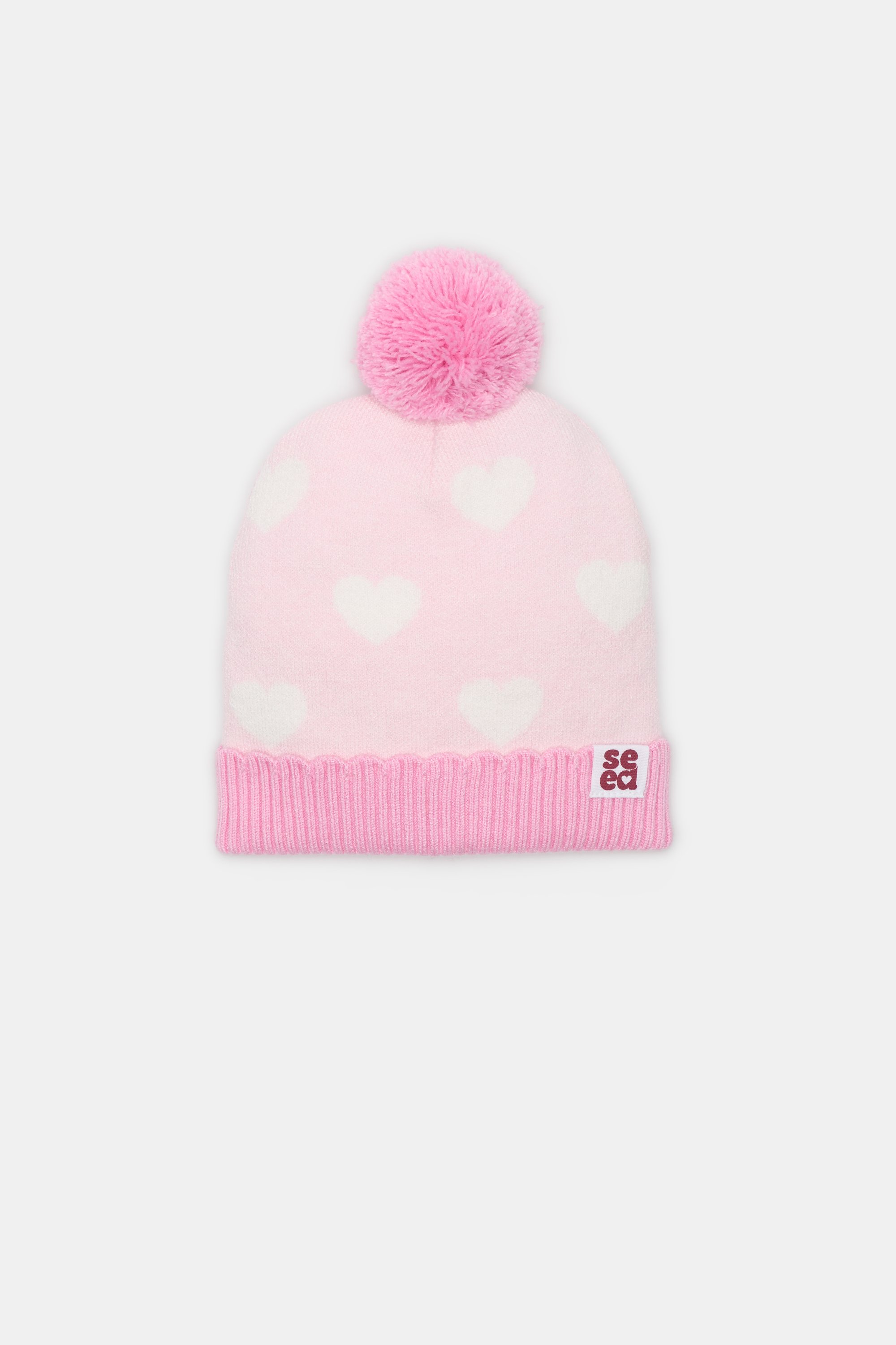 Cosy with a jacquard knit heart design, this beanie features a fluffy pom pom and a small Seed logo.