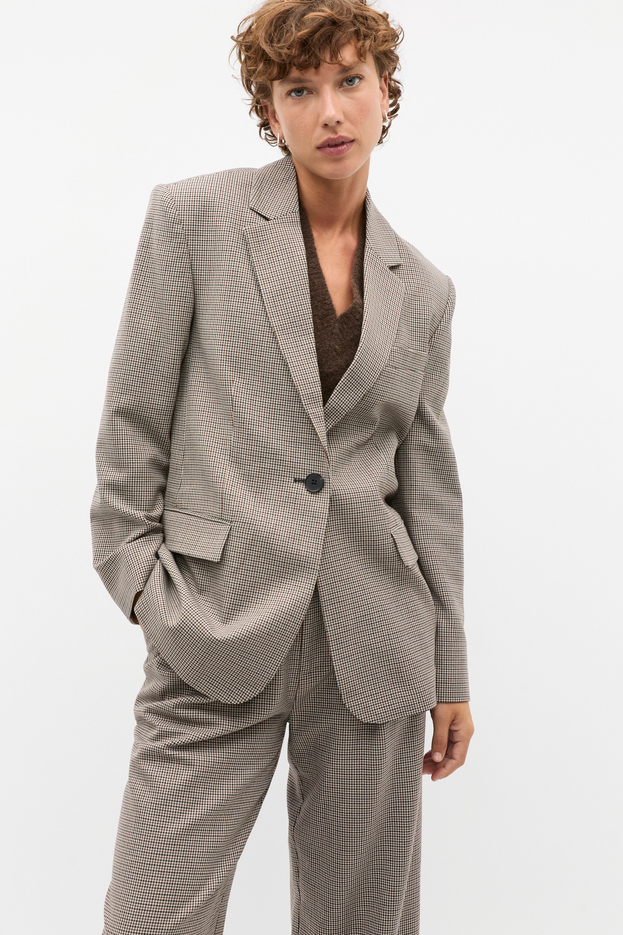 Designed with your workwear outfitting in mind, this houndstooth blazer is an instant classic. It features a notched lapel, long sleeves, front pockets, and is finished in a longline style. Complete your contemporary suiting moment with the houndstooth trousers.
