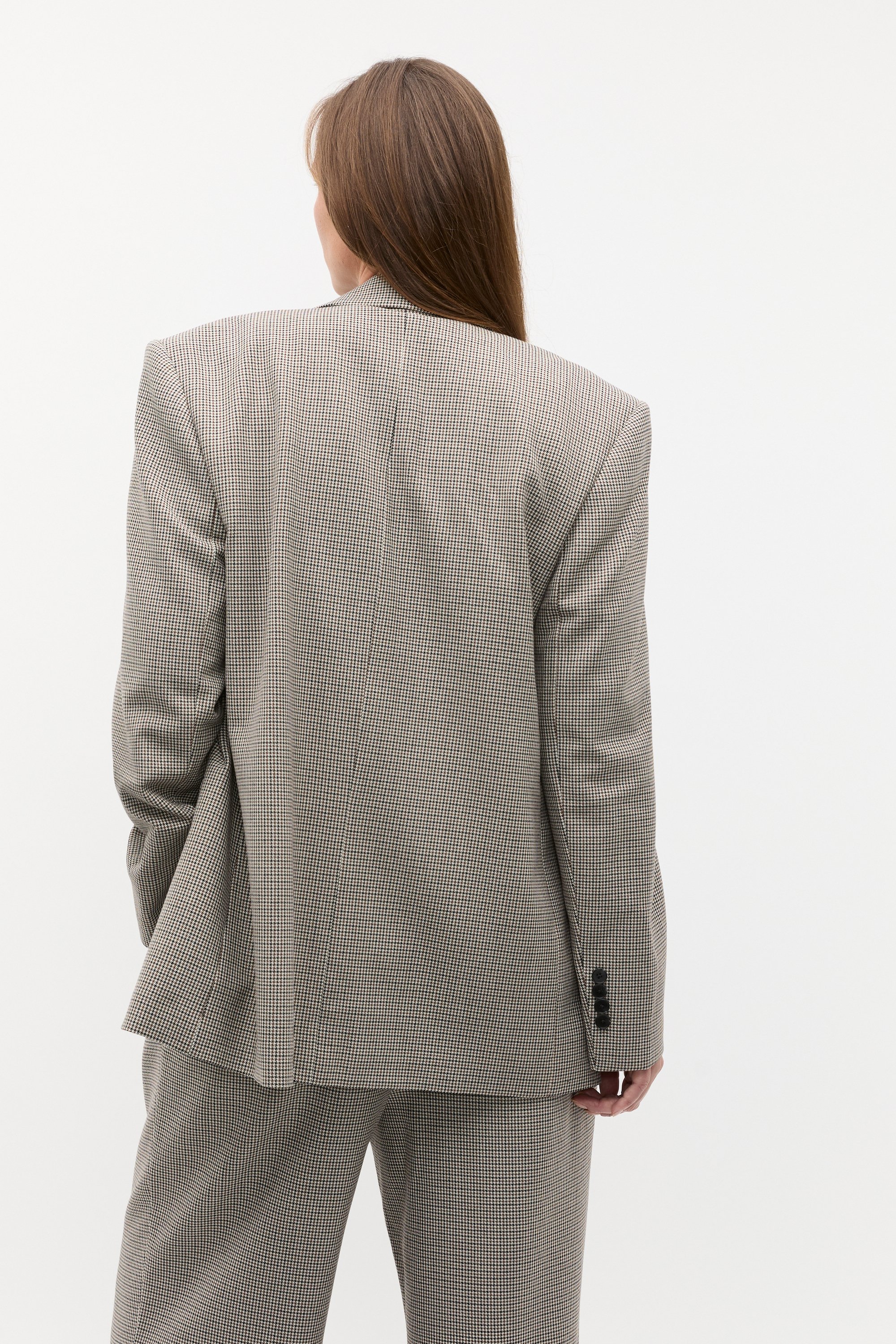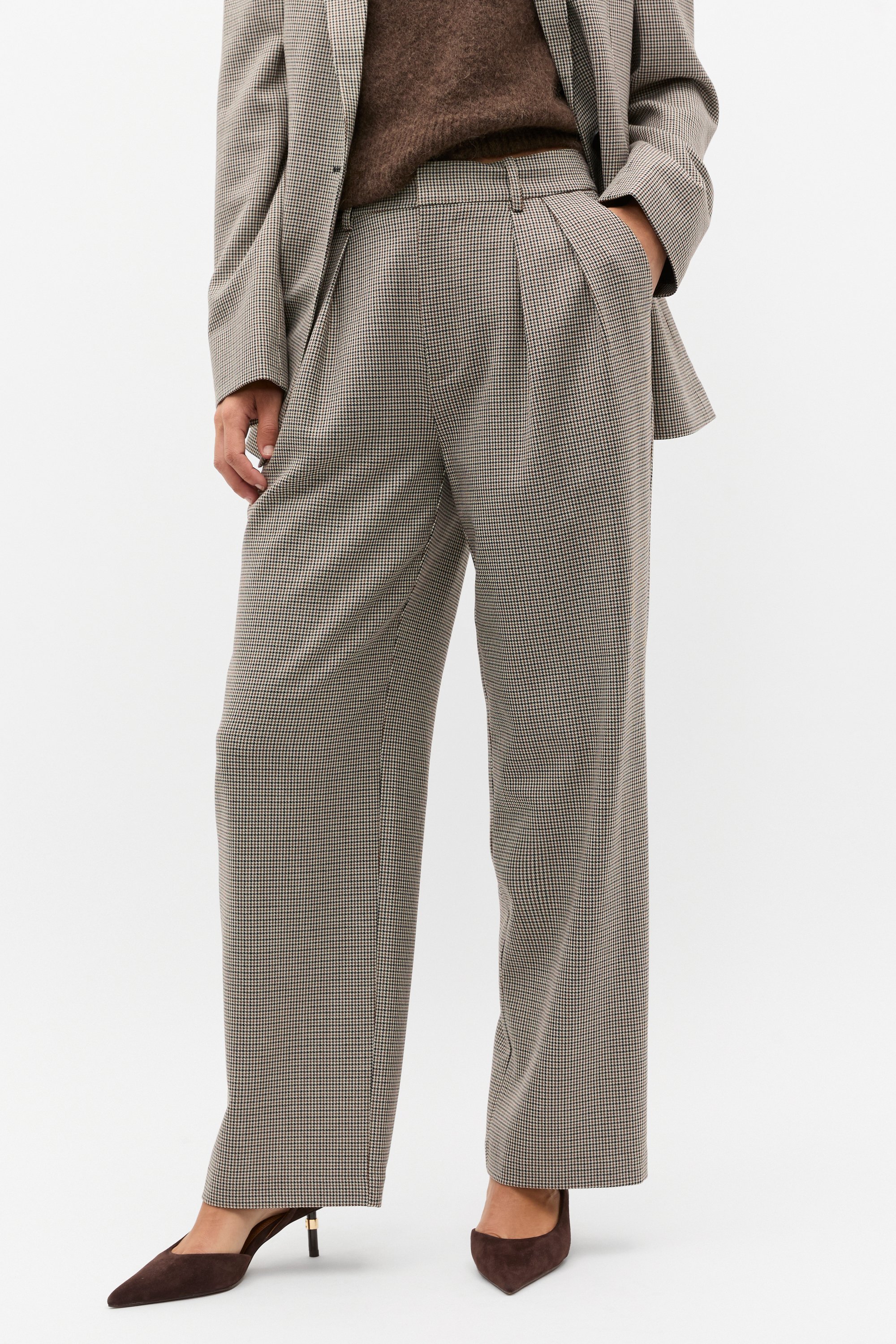 Update your work wardrobe with these houndstooth pants, a timeless design. They feature a fixed waistband, pleated details and have a wide-leg shape. For a head-to-toe suiting moment, style with the coordinating houndstooth blazer.