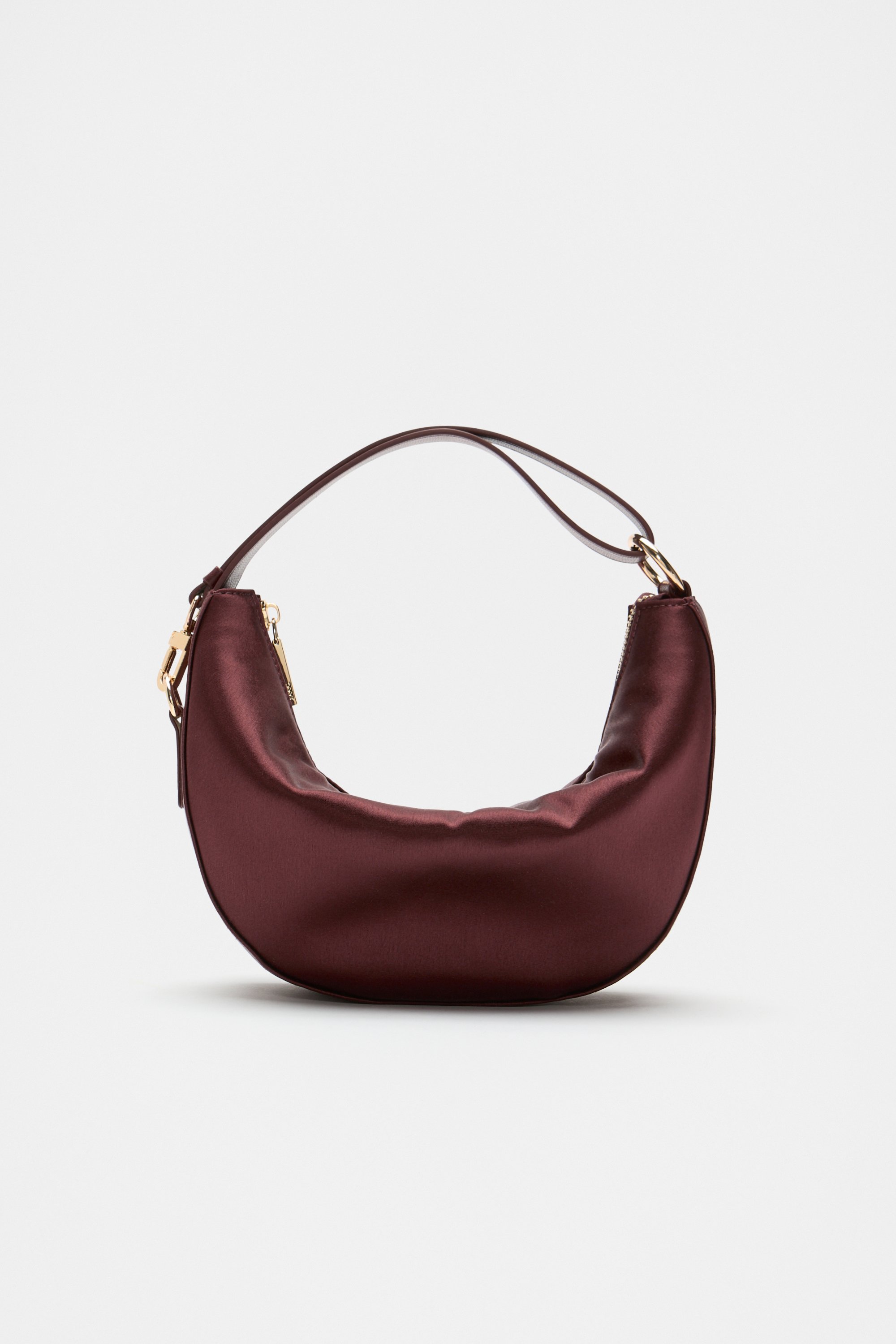 Chic with a contemporary edge, this bag makes a statement all in satin. It has a short carry handle finished with hardware details, a top zip closure and an internal zip pocket.