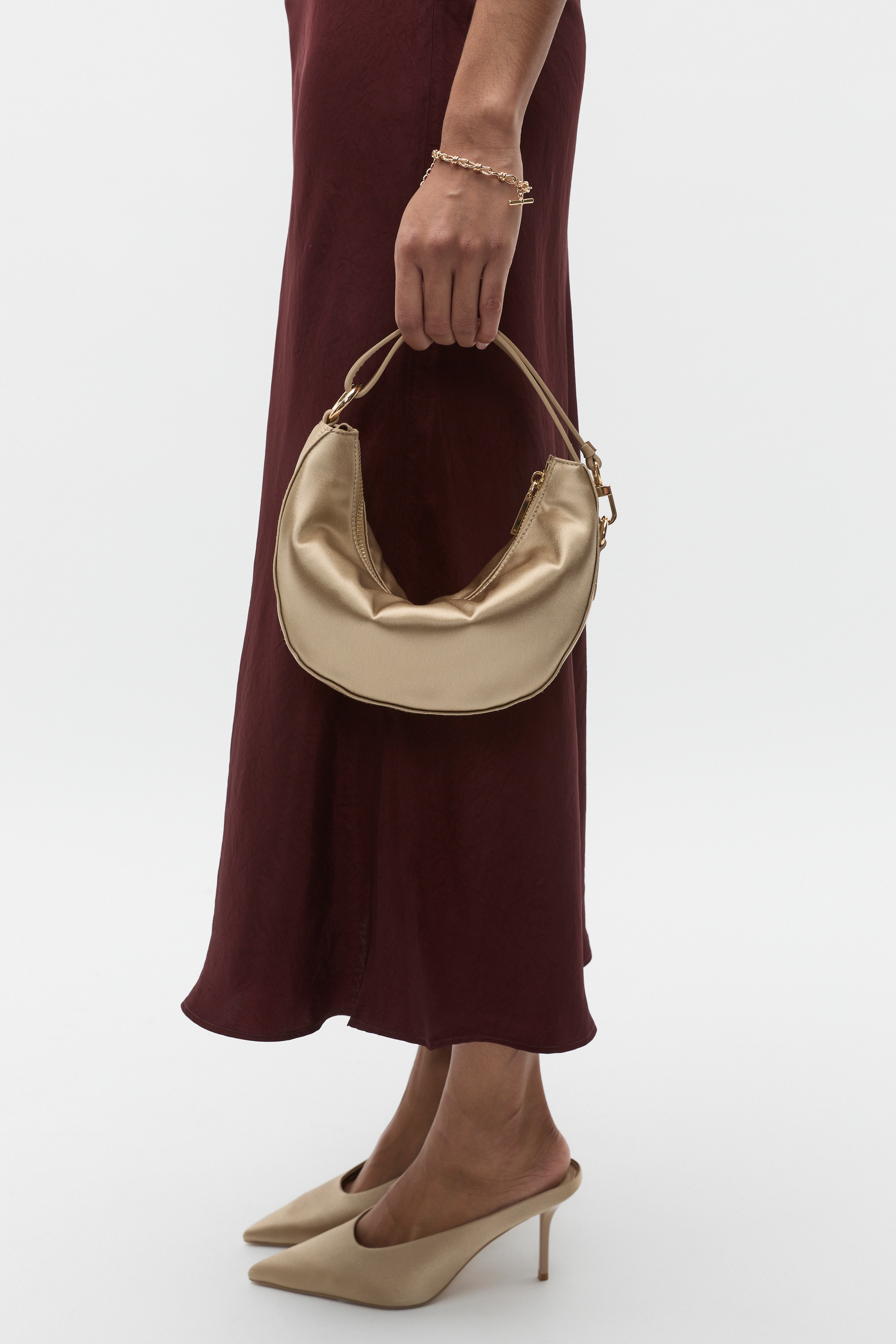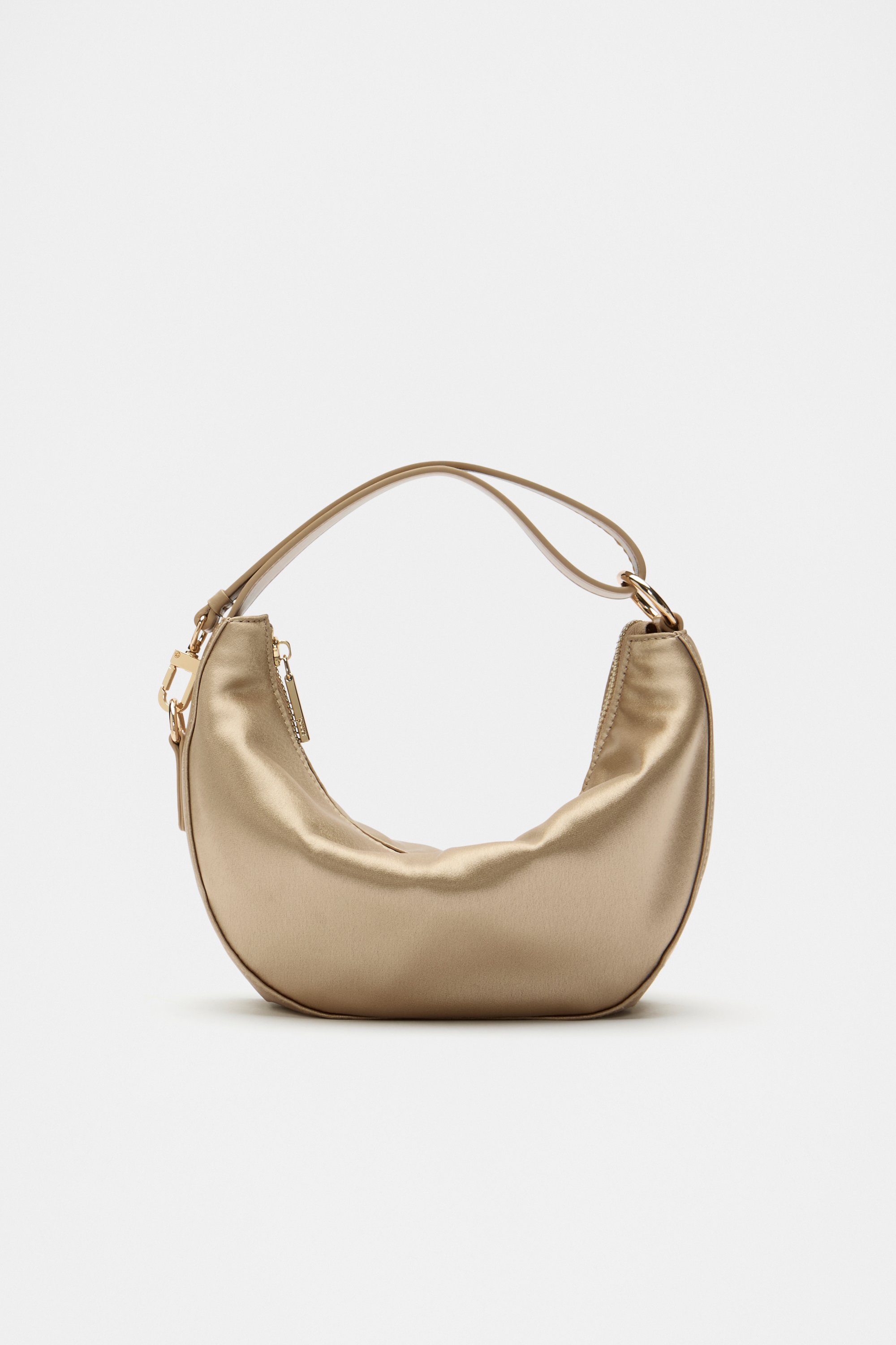 Chic with a contemporary edge, this bag makes a statement all in satin. It has a short carry handle finished with hardware details, a top zip closure and an internal zip pocket.