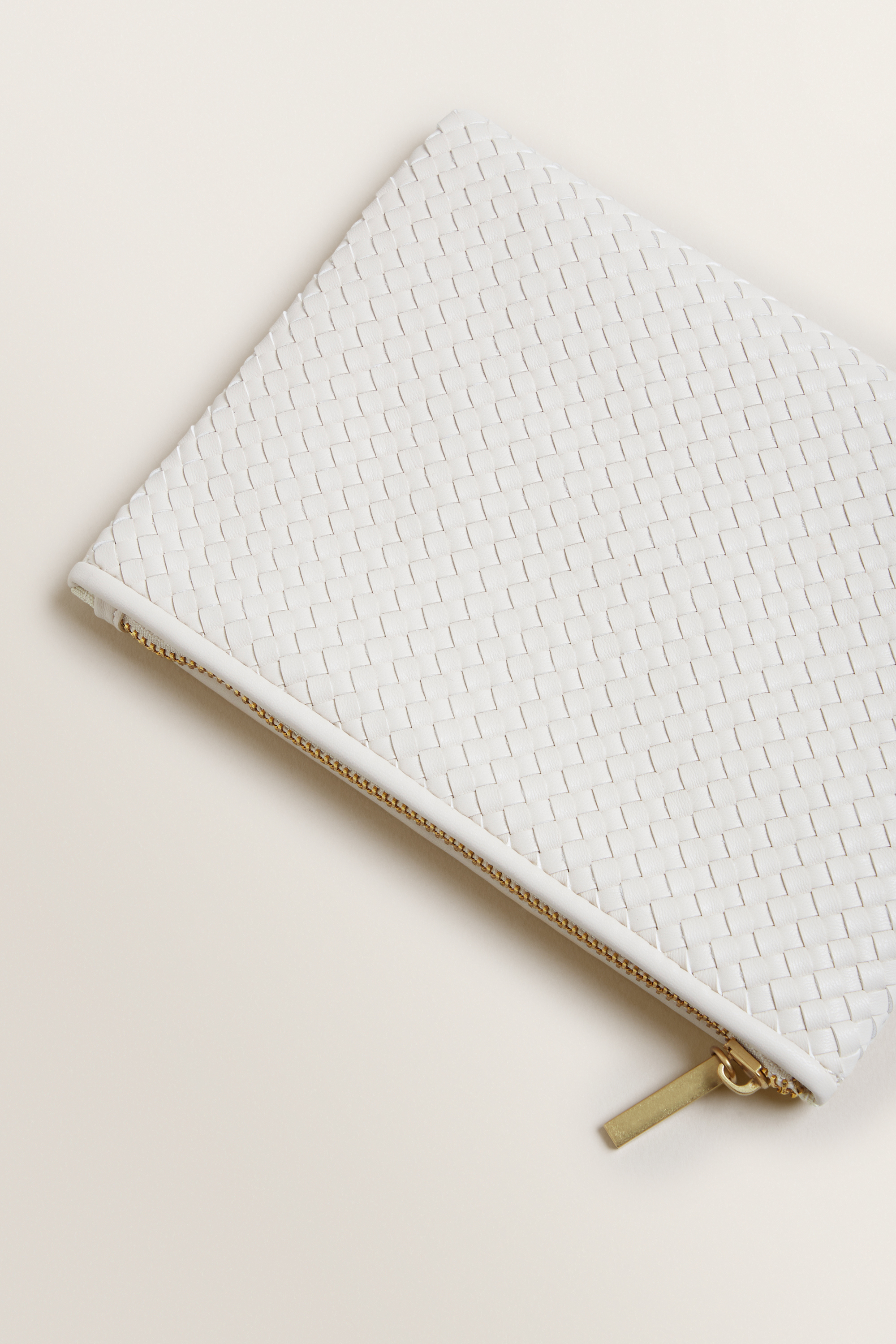 Boasting a woven leather-look exterior, this Mini Weave Pouch features brass hardware and zip-top closure.
