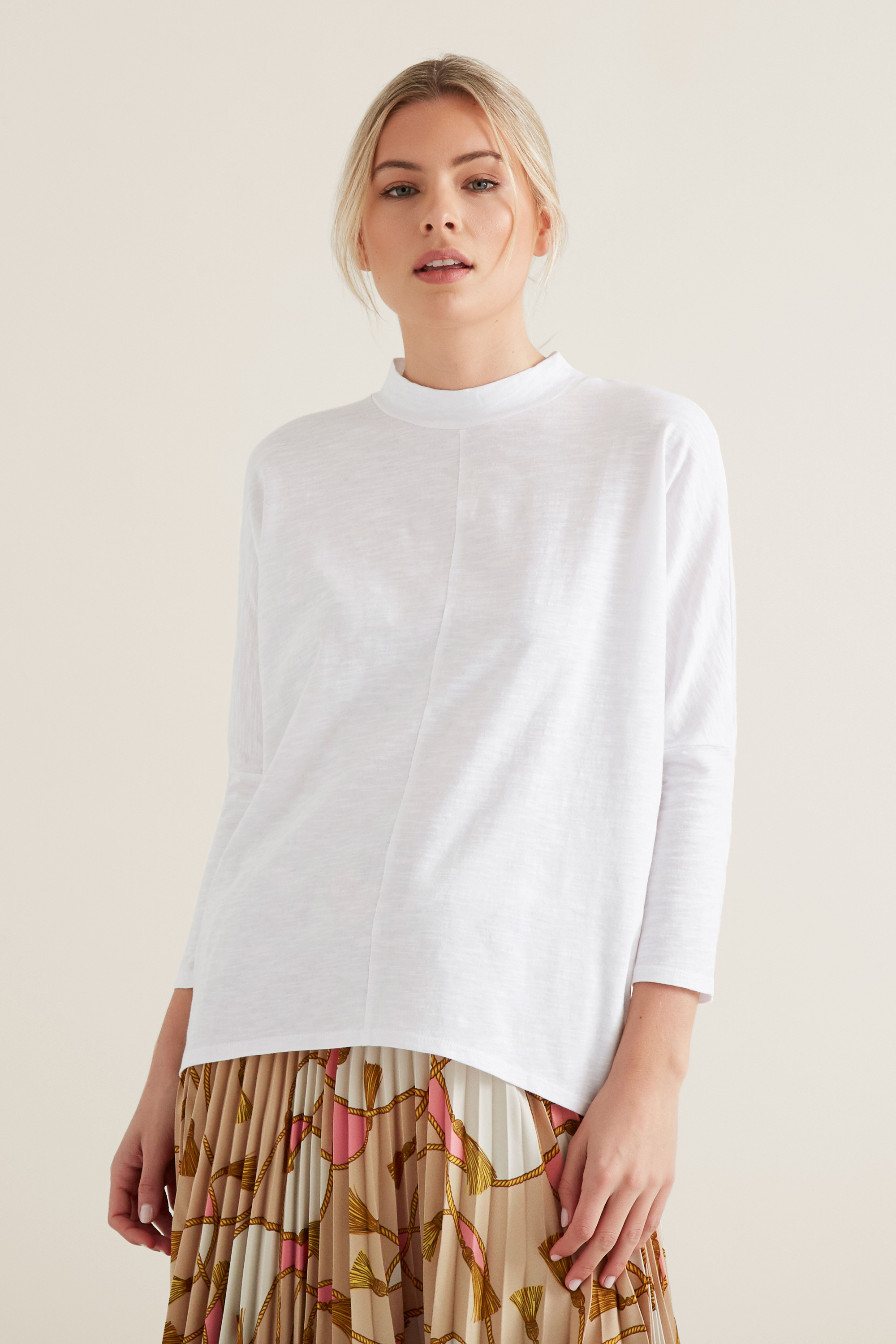 This relaxed Mock Neck Slub Top will take your outfit to the next level of comfort and style. It features a high neck, slim fitting sleeve and boxy structured silhouette Our model is 177 cm and wears a size 8. This Mock Neck Slub Top is made from a 100% Cotton blend, available in sizes XXS to XL. Check the label inside of the garment for care instructions.