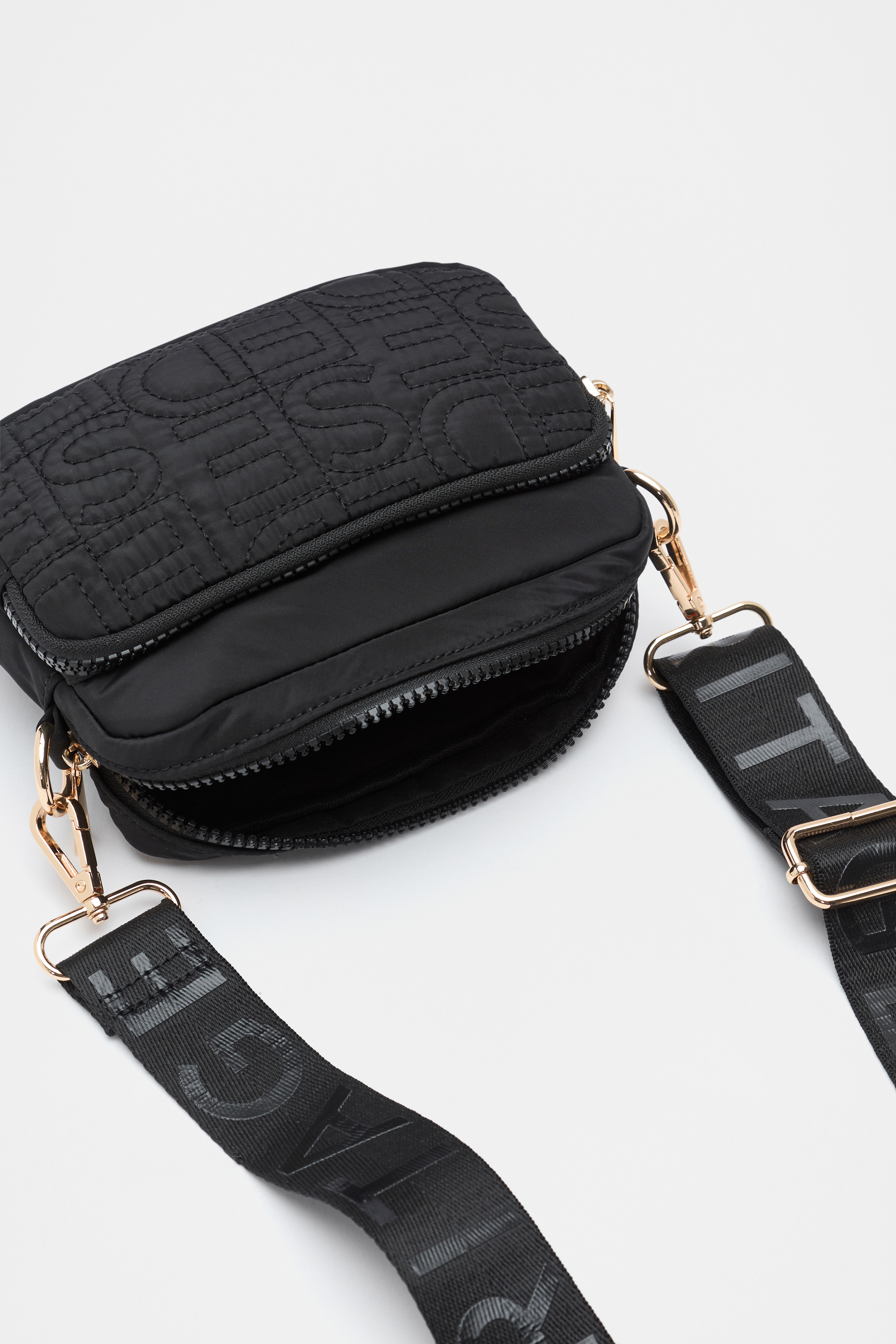 Chic and understated, this crossbody bag offers style and everyday convenience. A slim design, it features an embroidered logo design across the front, a detachable logo strap with gold hardware and a front pocket.