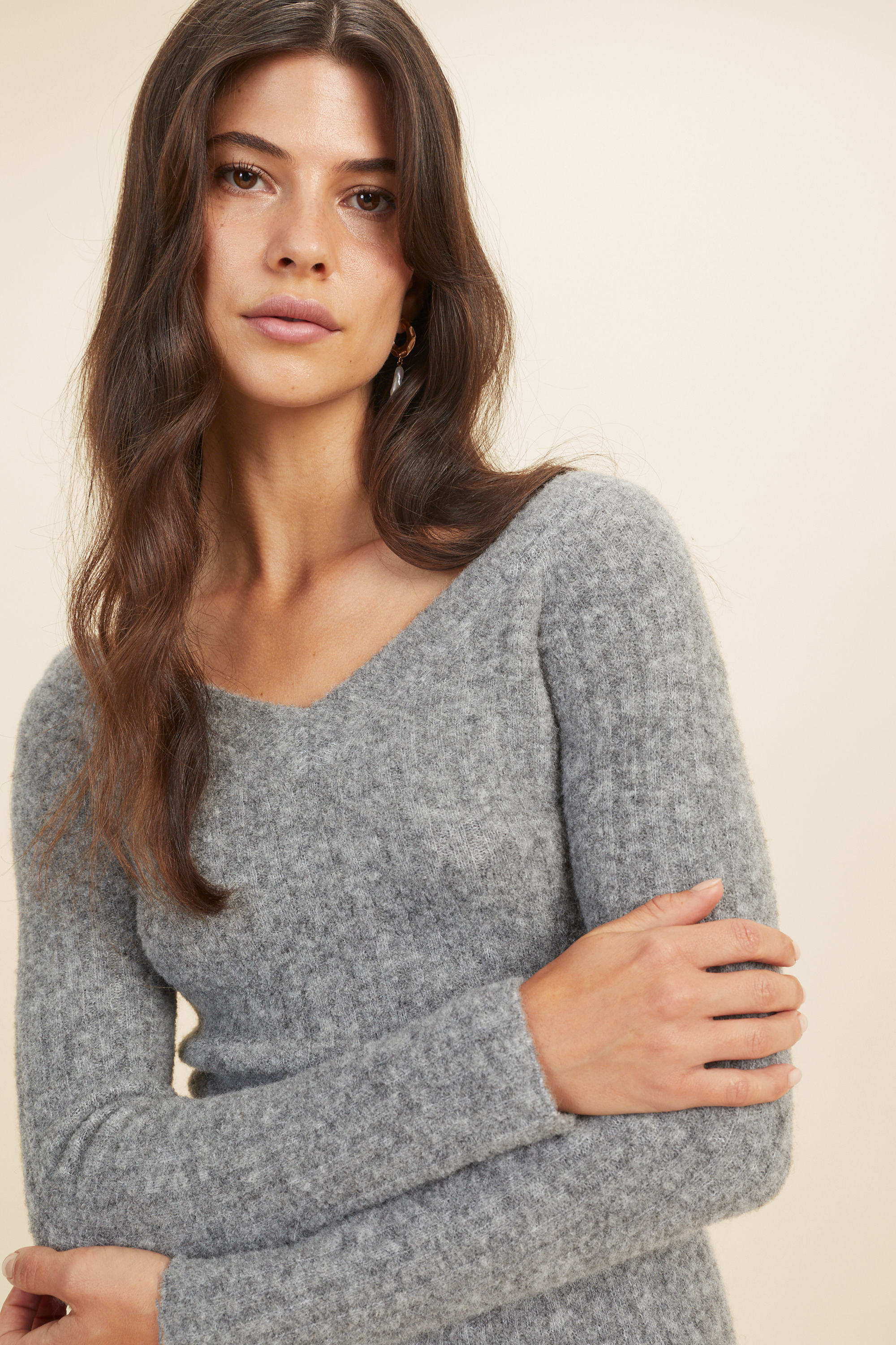 Made from a super soft wool blend, this sweater features an all over rib fabric. Made to fit neatly against the body, this sweater is designed with a deep v neckline and cropped silhouette