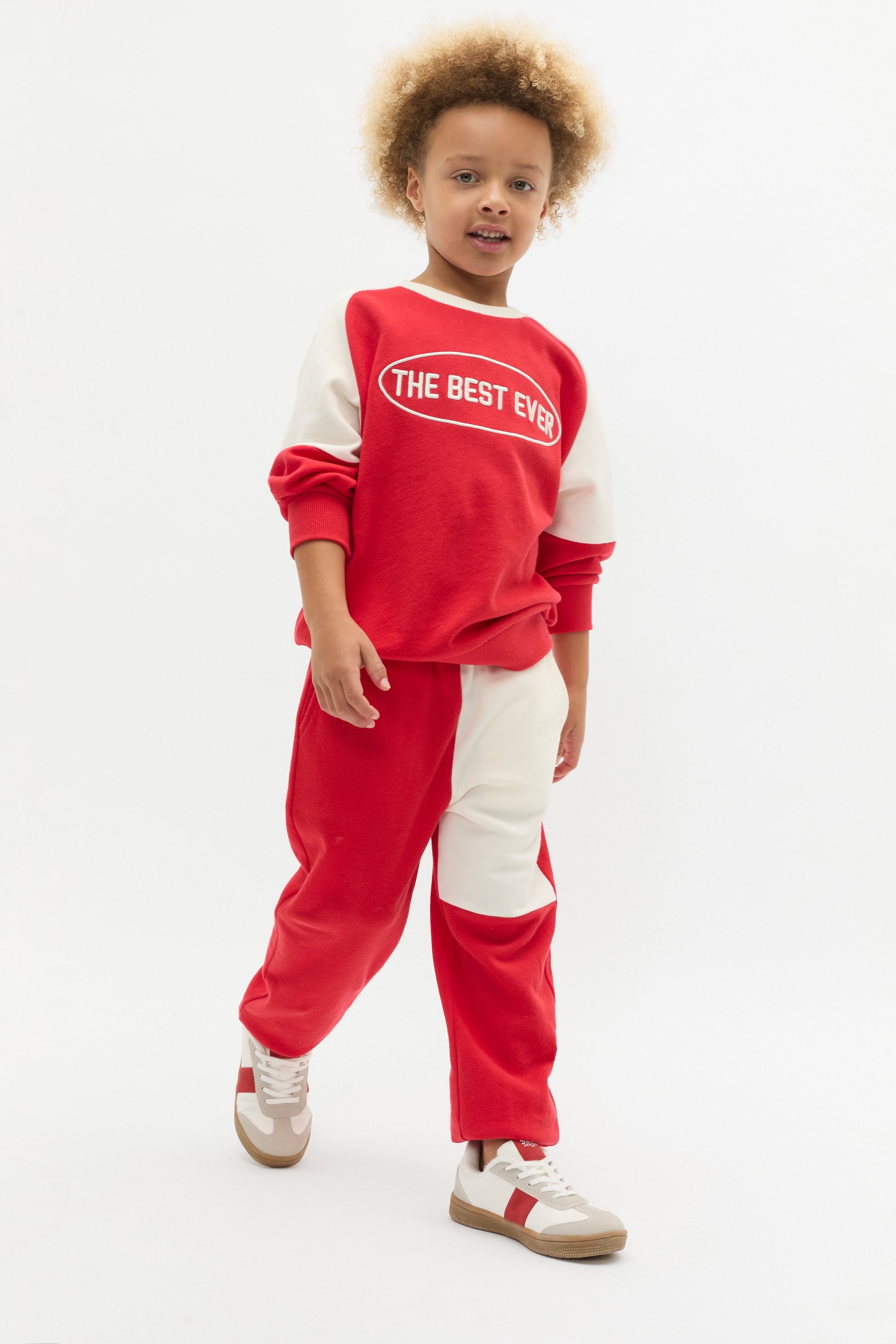 Soft, cosy and effortlessly cool, this sweater is set to be his new everyday go-to. Crafted in premium cotton, it features a crew neck, long sleeves with a colourblock detail and a playful embroidered graphic across the front. Coordinate his look with the matching colourblock tracksuit pants, the perfect winter-ready set.