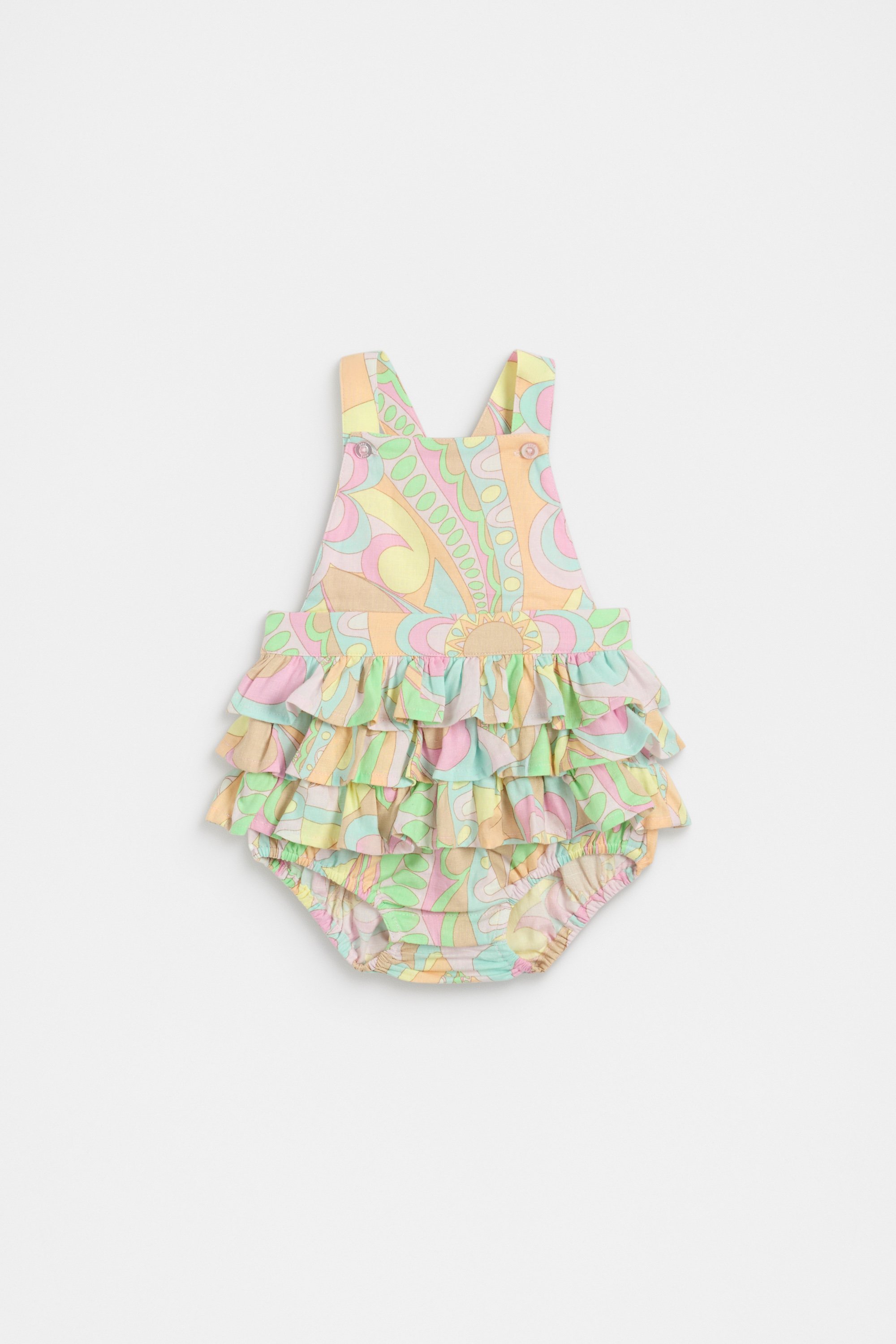 So adorable and pretty, this little romper is the perfect statement style to add to her wardrobe. Crafted in a lightweight blend, it features adjustable straps, a ruffle trim design and an all-over colourful paisley print. It has snaps at the gussets for easy changes.
