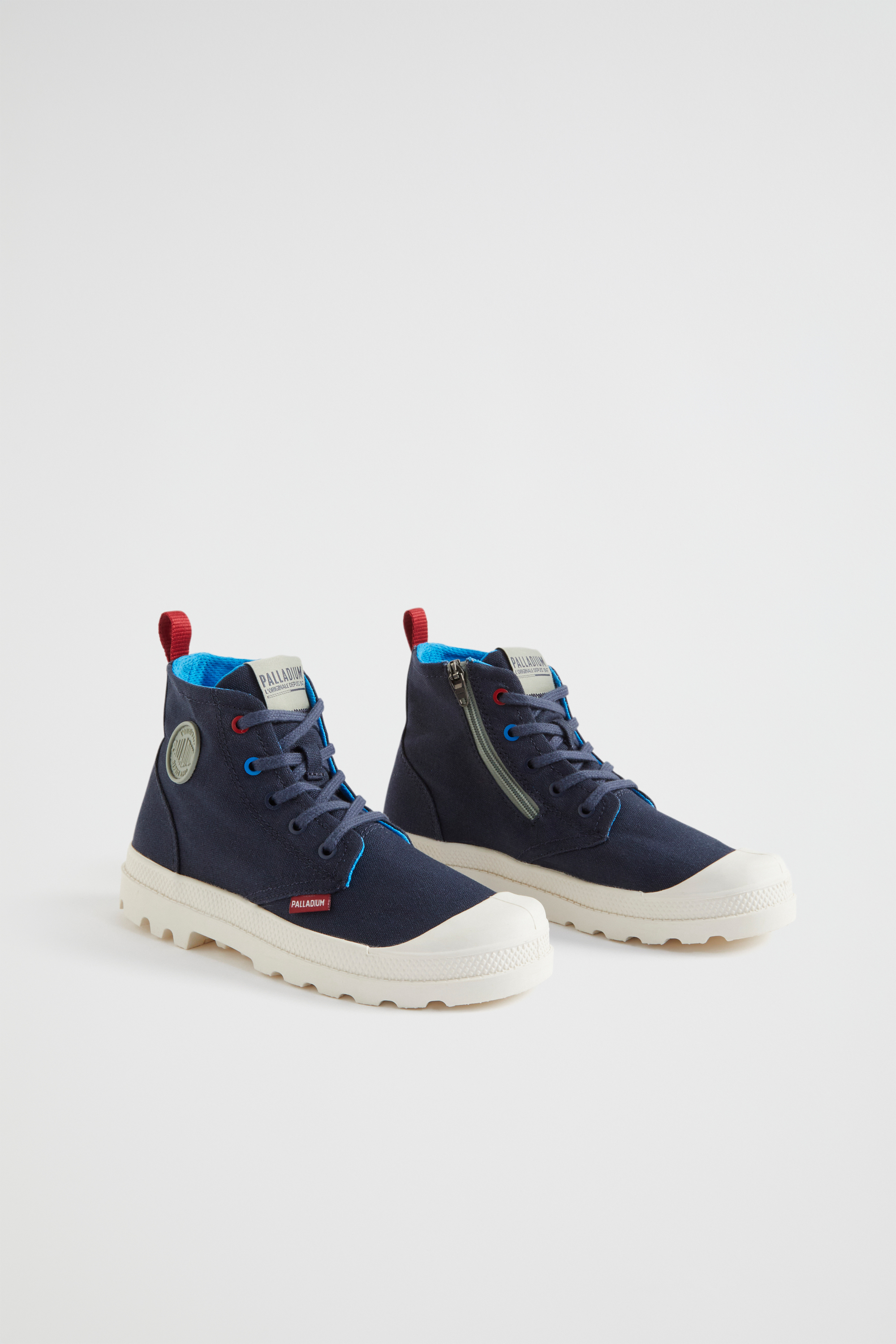 Fun and retro, these Palladium sneakers are an ideal addition to any wardrobe. They are a lace-up style with a lightweight chunky sole, a rubber toecap, a stonewashed canvas upper, and a contrasting zip closure and pull tab.