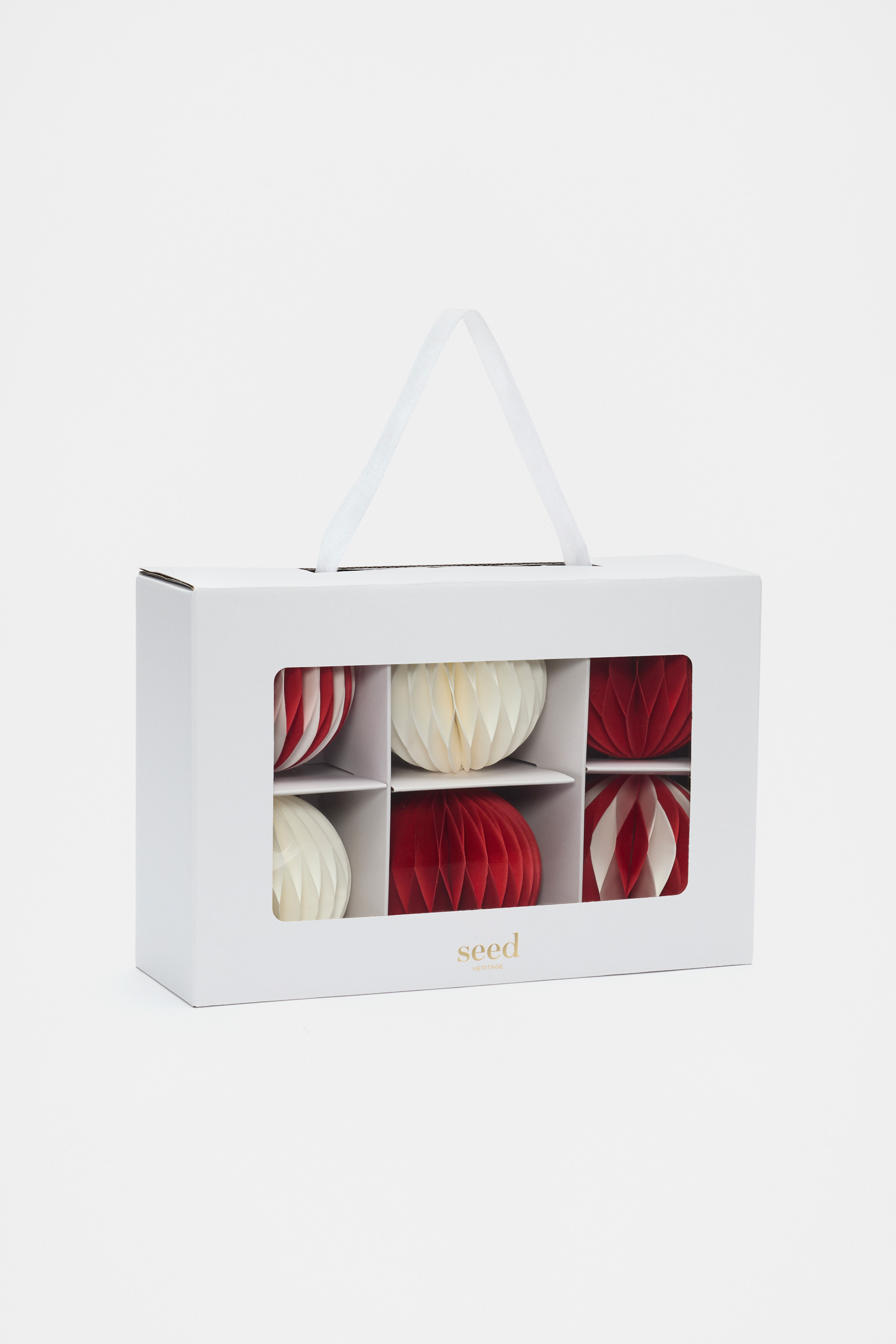 Perfect to hang on your tree or mantel, these delicate paper baubles are beautiful and light. Set includes six paper baubles available in two different colourways. Each bauble folds flat for easy storage.