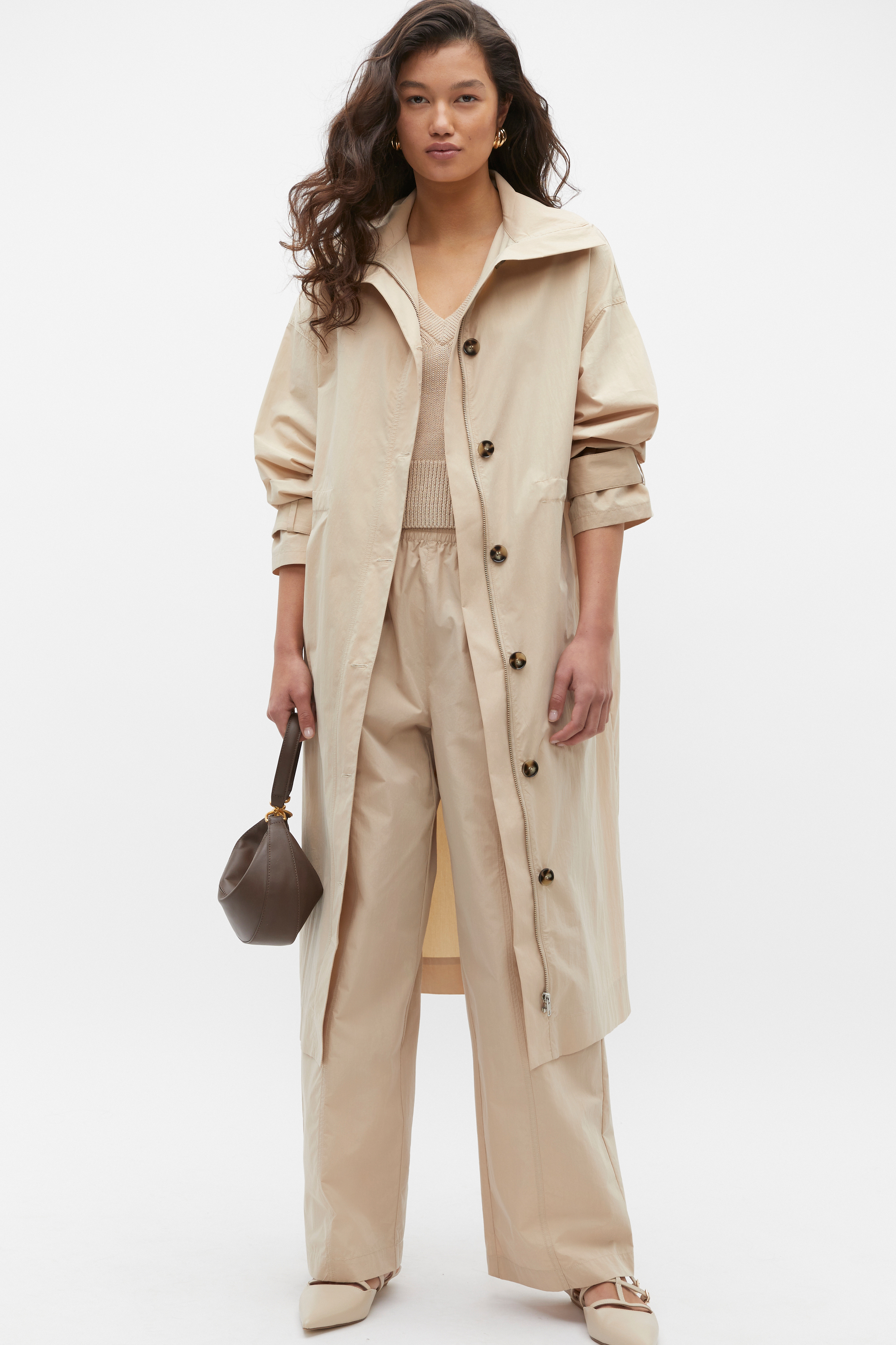 An ideal outer layer for your transeasonal wardrobe, this jacket is crafted from a cotton blend with a parachute effect. It features a high neck, a button front, angled welt pockets, and sleeve loops. It's a mid-length jacket with a drawstring waist detail, creating a chic cinched silhouette.
