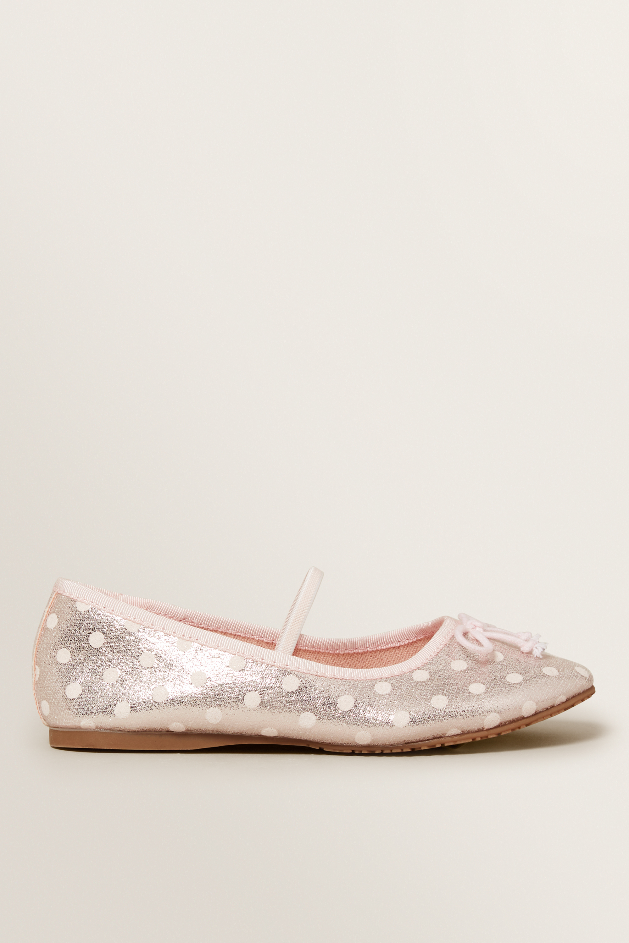 Dance all day in these Spot Ballet Slippers. Featuring an elasticised band for comfort, they are detailed with a decorative bow and dainty spot print all over. Made from a PU Upper and Rubber Sole, they are available in sizes 23 to 33.