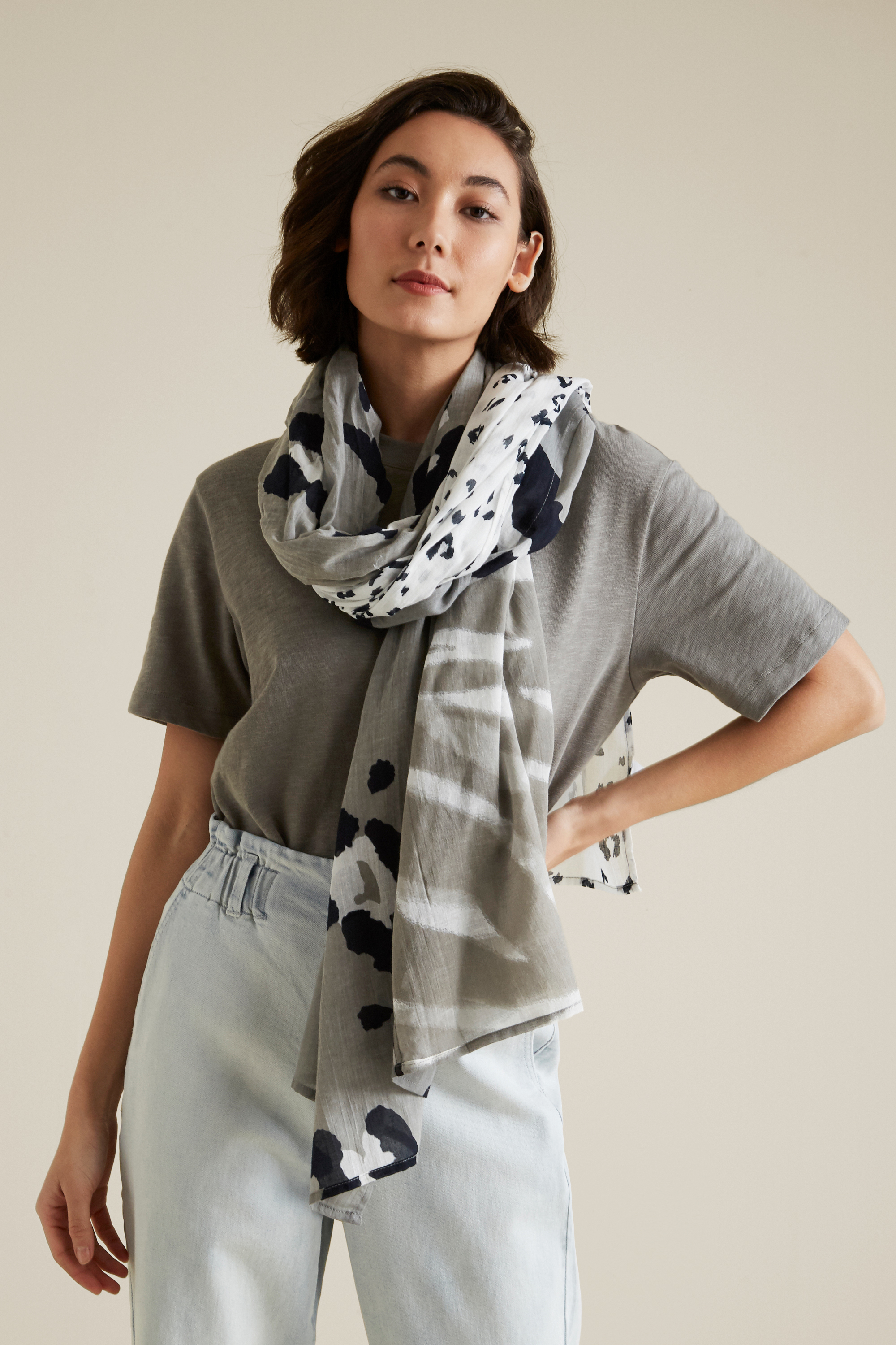 In a lightweight woven fabrication, this scarf features a beautiful neutral patchwork animal design.