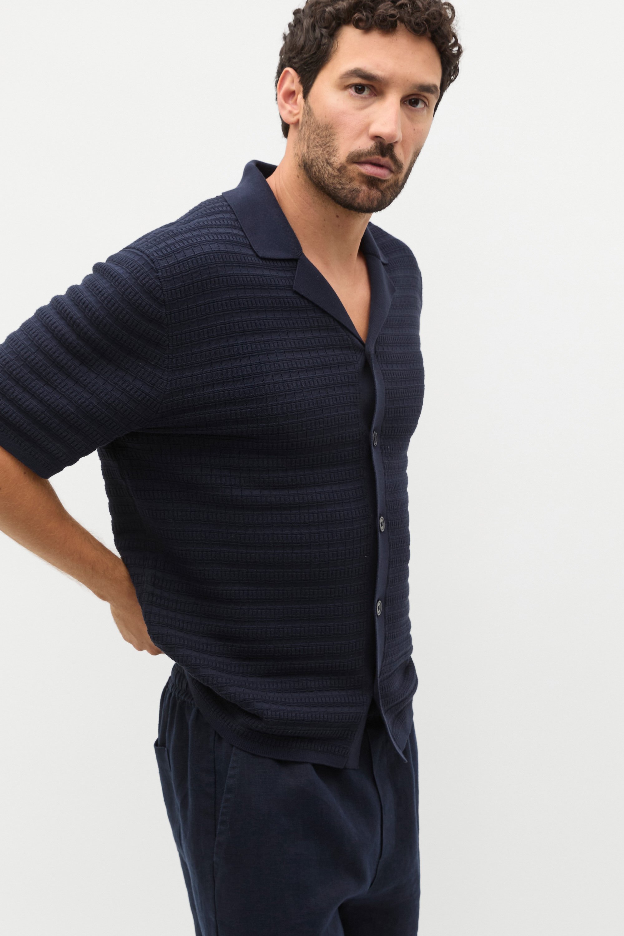 With a soft knit finish, this shirt is an elevated option for his casual wardrobe, perfect for weekend events. Crafted in premium cotton, it features a notched collar, short sleeves and a button-through front. Can be styled alone or worn open over a t-shirt.