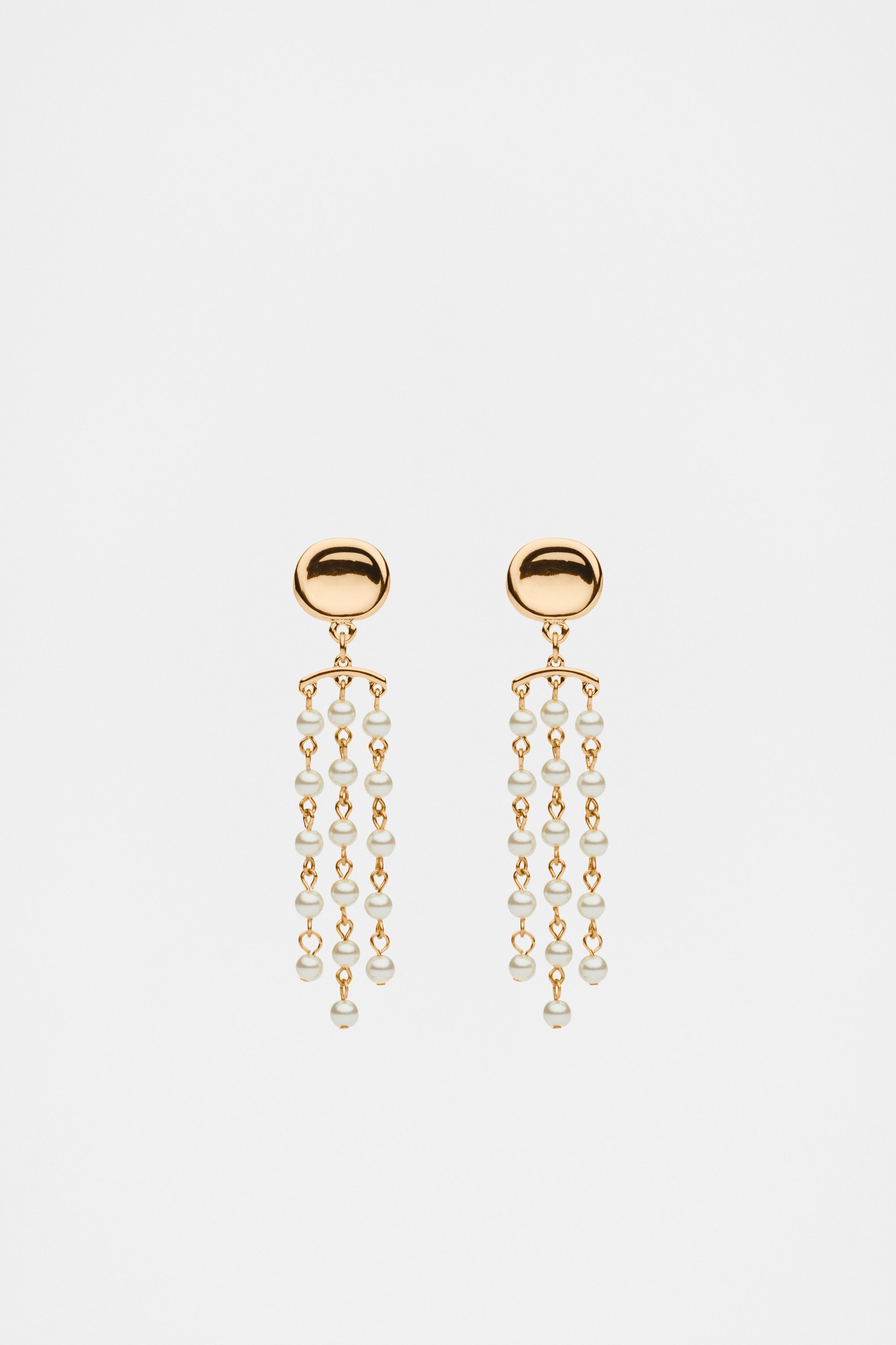 Designed for instant polish, these earrings are a statement style with delicate details. They feature a simple gold stud with dangling chains decorated with glass pearls. Style with the coordinating pearl pieces for a curated feel.