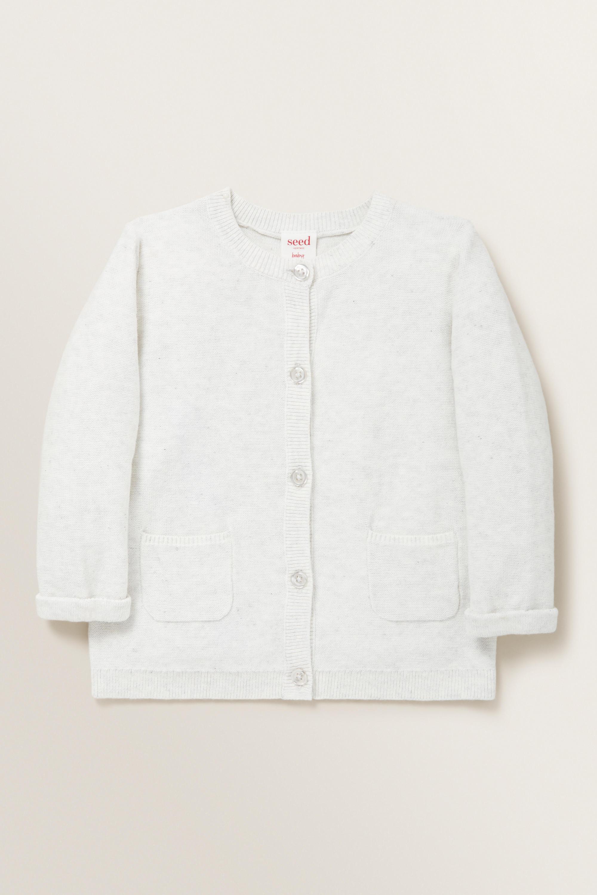 Layer up with this Pearl Stitch Cardigan. Available in two colourways, this soft-knitted cardigan features a circle neckline, horn button closures, long sleeves, rolled cuffs, patch pockets, and a loose-fitting silhouette for everyday wear. For care instructions, please check the label inside of the garment.