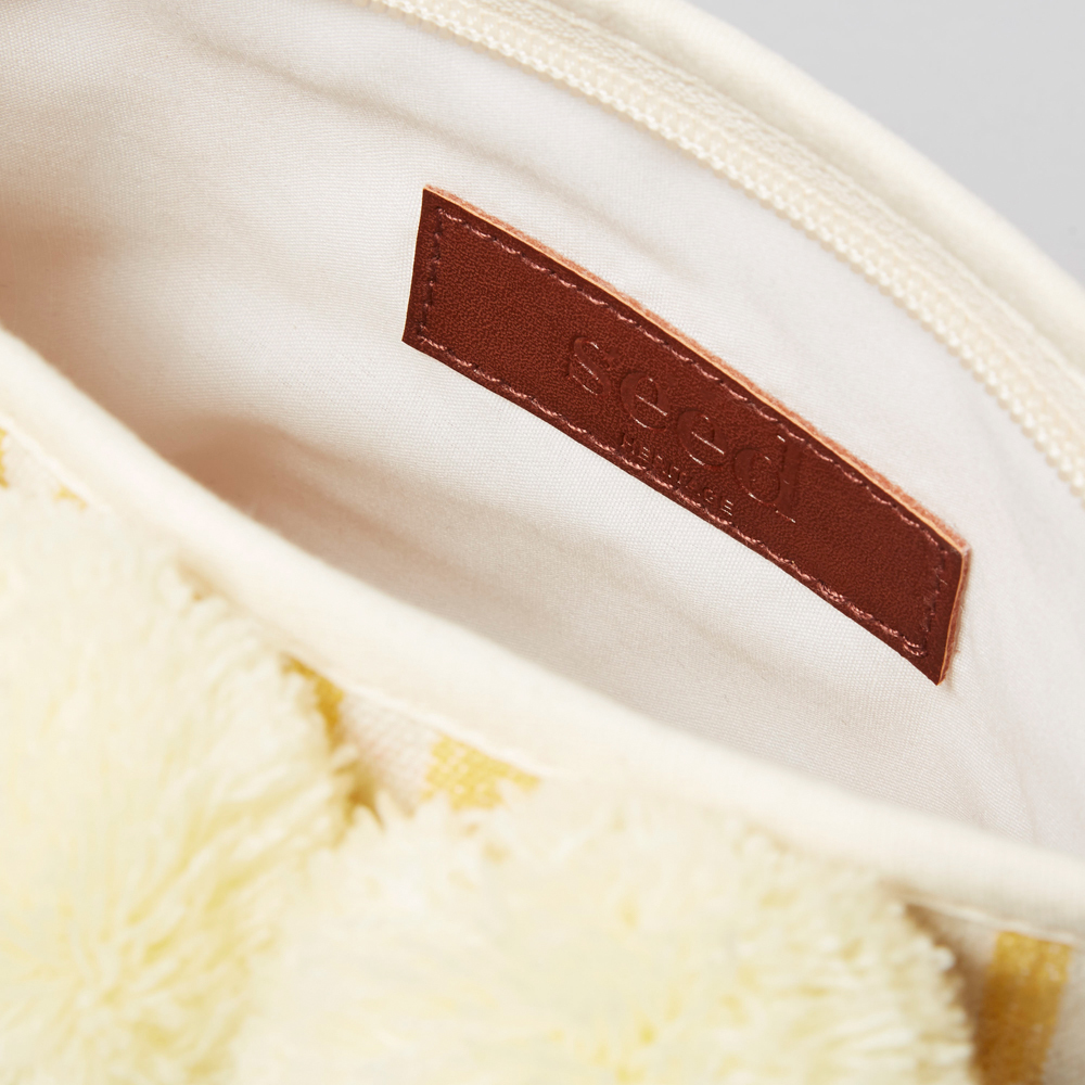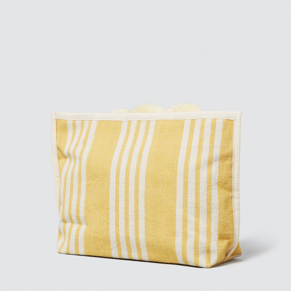 Embrace a fresh and summery style with this uplifting zip-up cos case. Featuring a bold stripe pattern and a whimsical pom pom trim, it is perfect for gifting or for storing your own makeup or jewellery. Made from fabric, this piece is available in Black and Yellow and in one size.