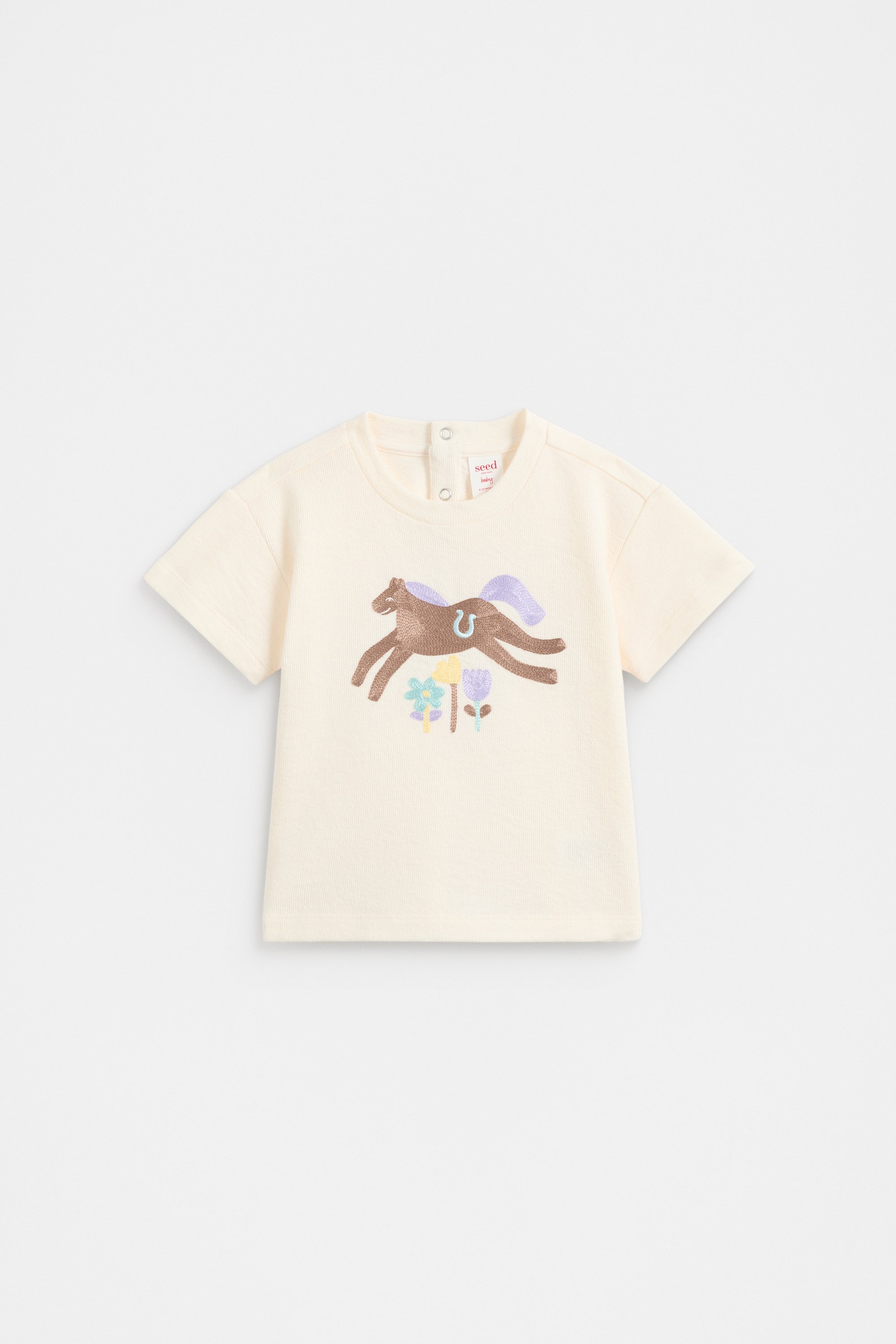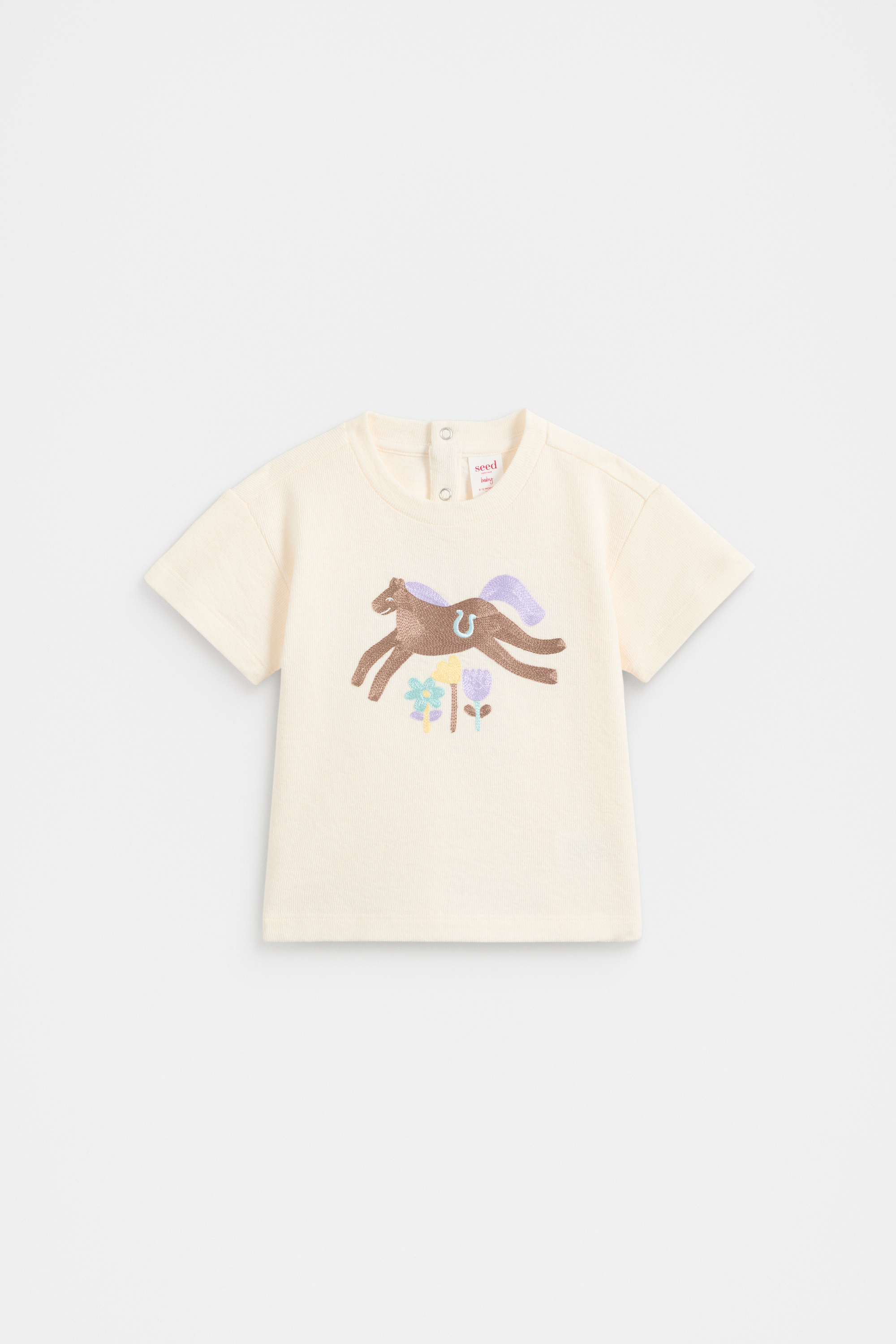 With an adorable pony design, this tee is a comfortable option for everyday wear. Crafted in premium cotton with a soft knit finish and a little stretch, it features a round neck, short sleeves and snaps at the back of the neck for easy changes.