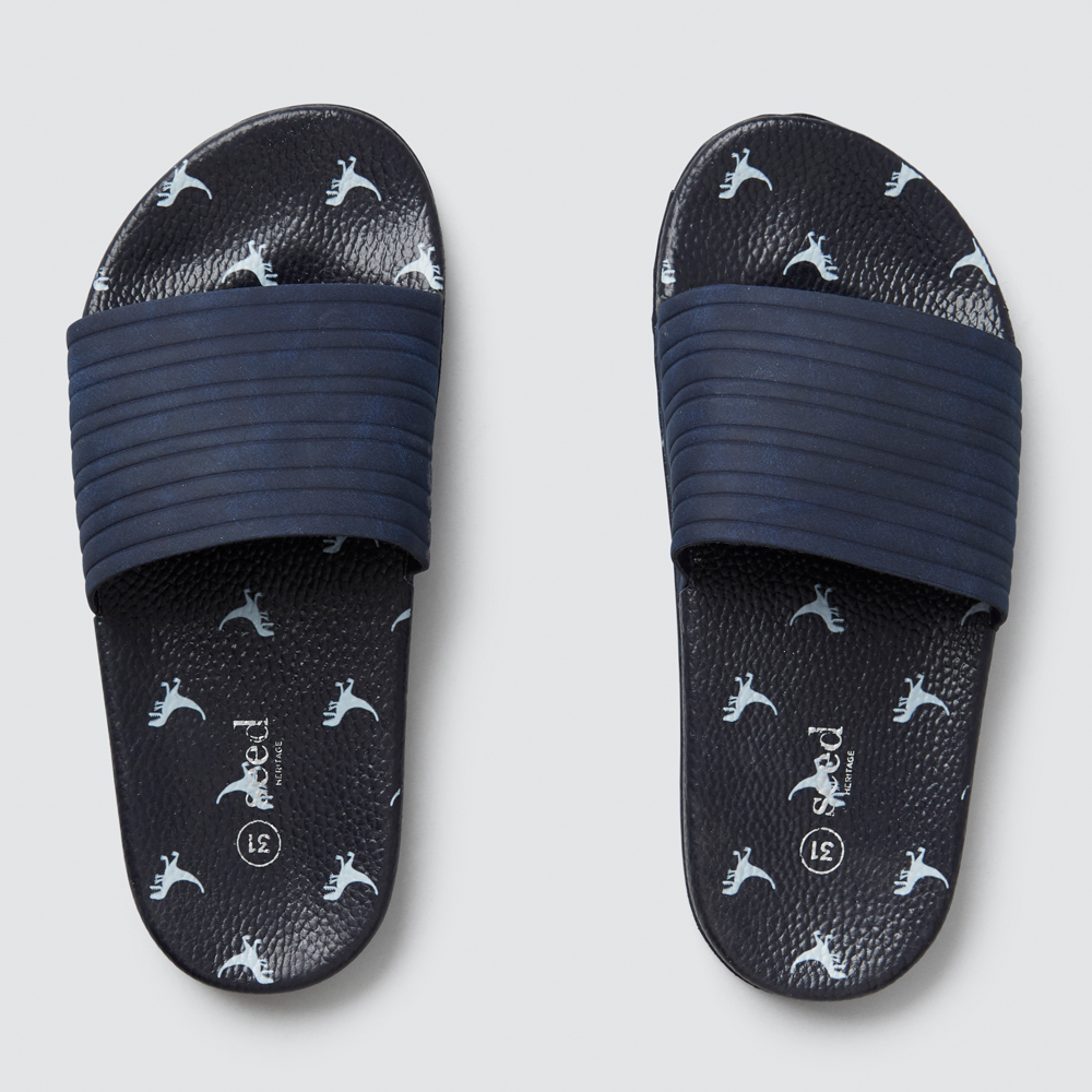 With a fun dino yardage print on the sole and a comfy textured foot strap, these sweet slides are the ultimate warm-weather accessory. The fresh navy hue is both versatile and super-summery. Made with a PU upper and a rubber sole, this piece is available in Navy and in sizes 26 to 33.