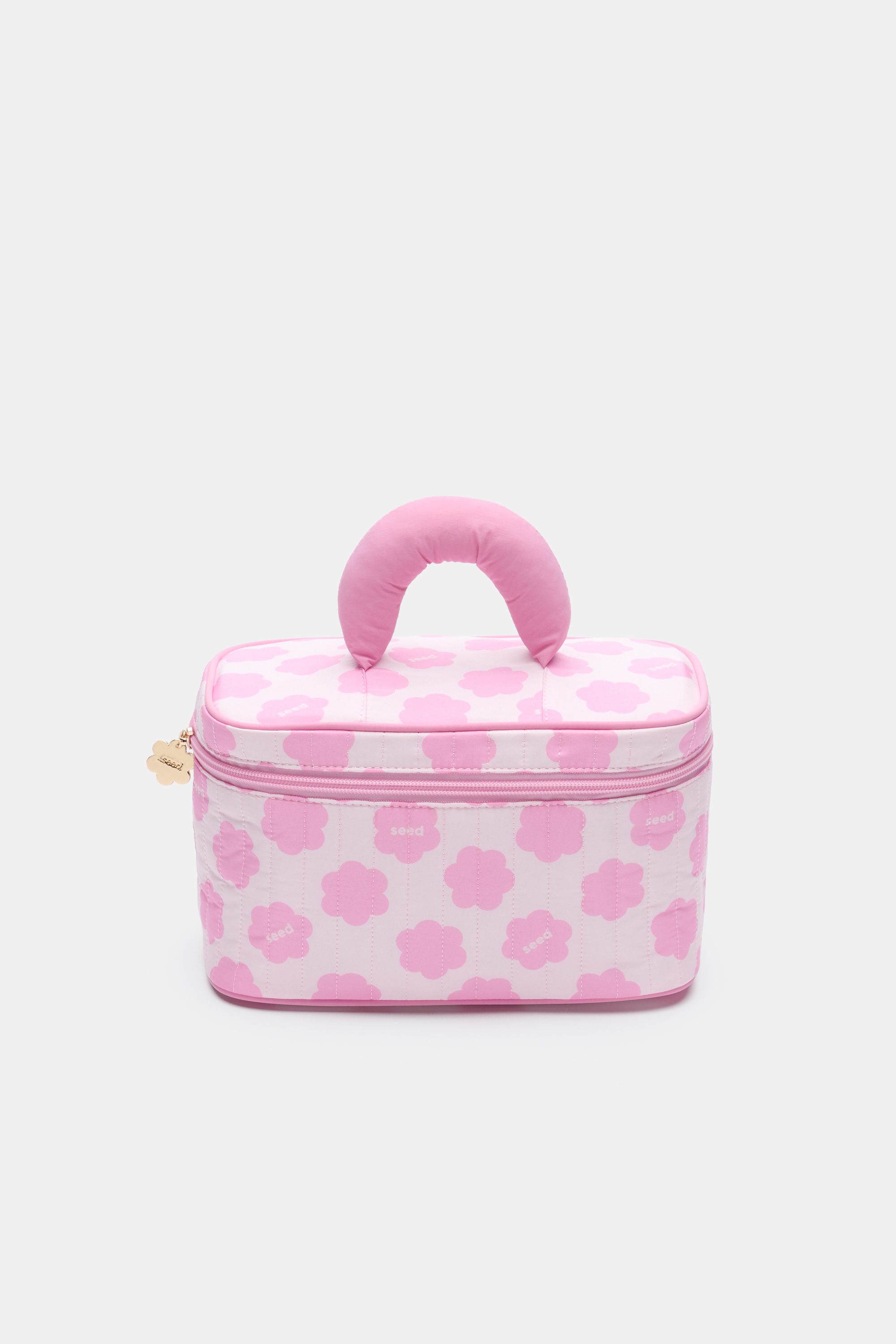 Ideal for travel, this cosmetics case has a puffy quilted finish with a flower design. It's fully lined, secures with a heart-shaped zipper and has a short puffy handle.