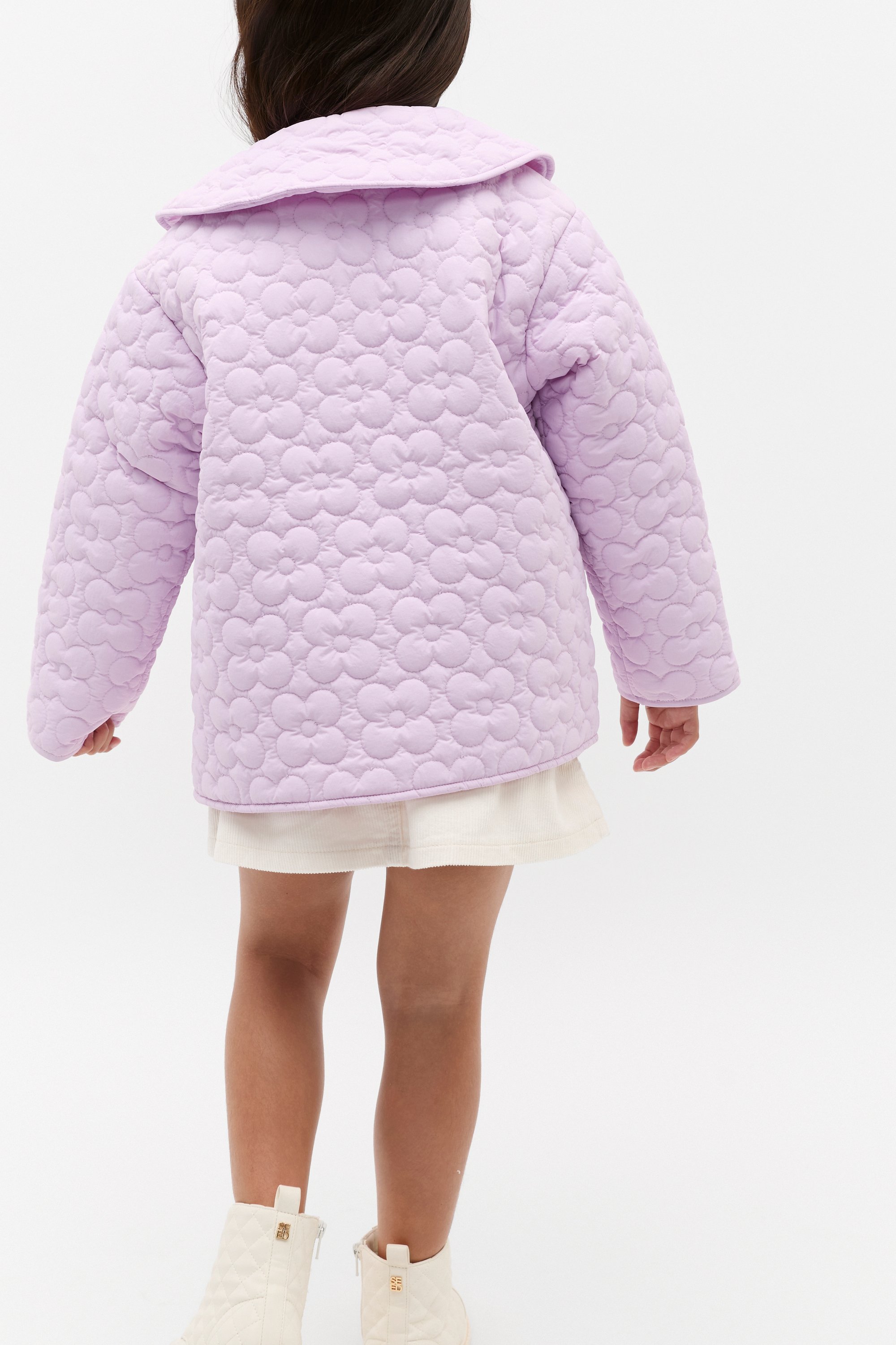 With a quilted finish and a Peter Pan collar, this jacket has the sweetest details to dress up her look. It has long sleeves, a button front and two button-up front pockets.