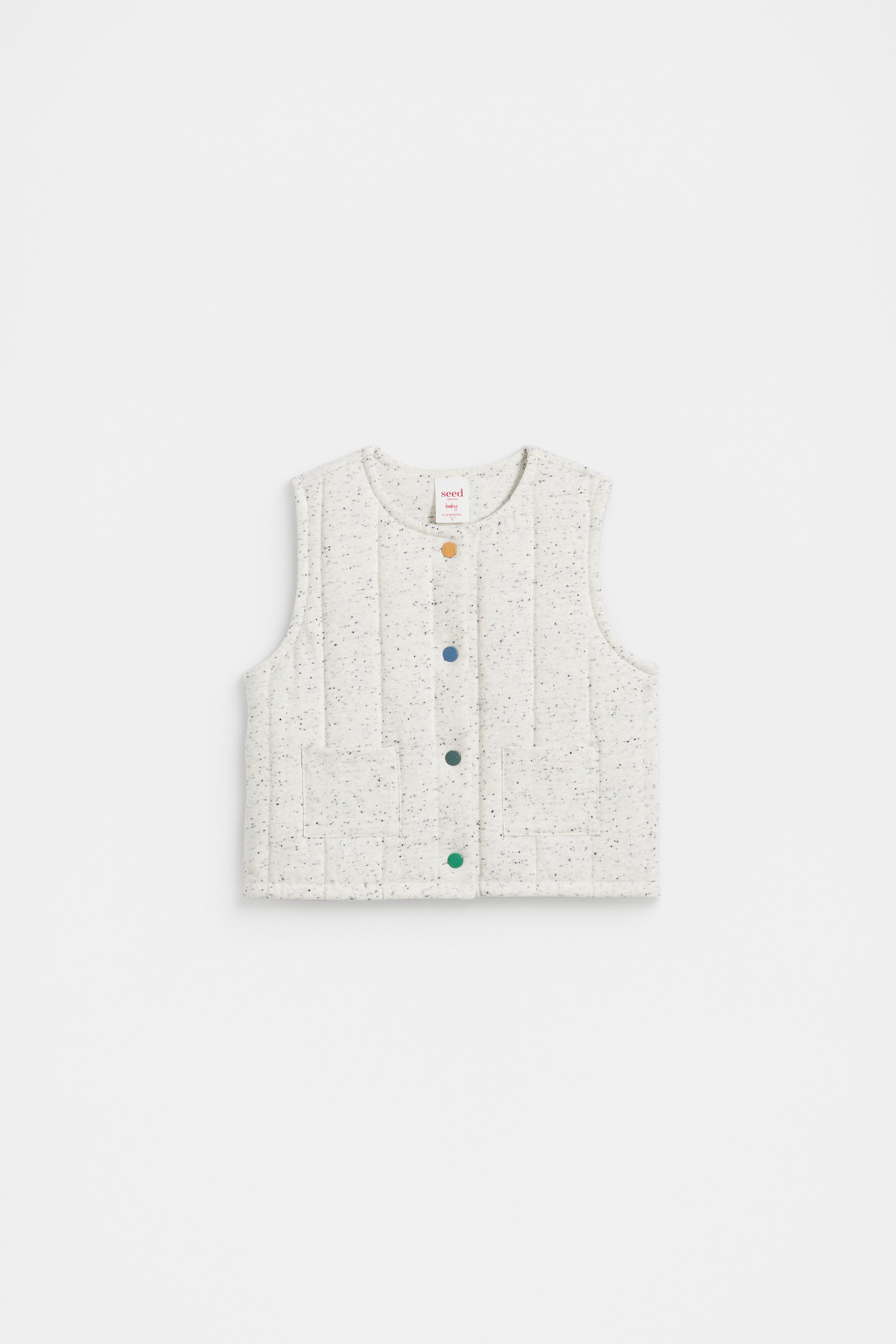 An adorable layer to finish his look, this vest has the sweetest details. Crafted in an ultrasoft premium cotton, it has a speckled quilted finish and colourful buttons, a sleeveless shape and front pockets.