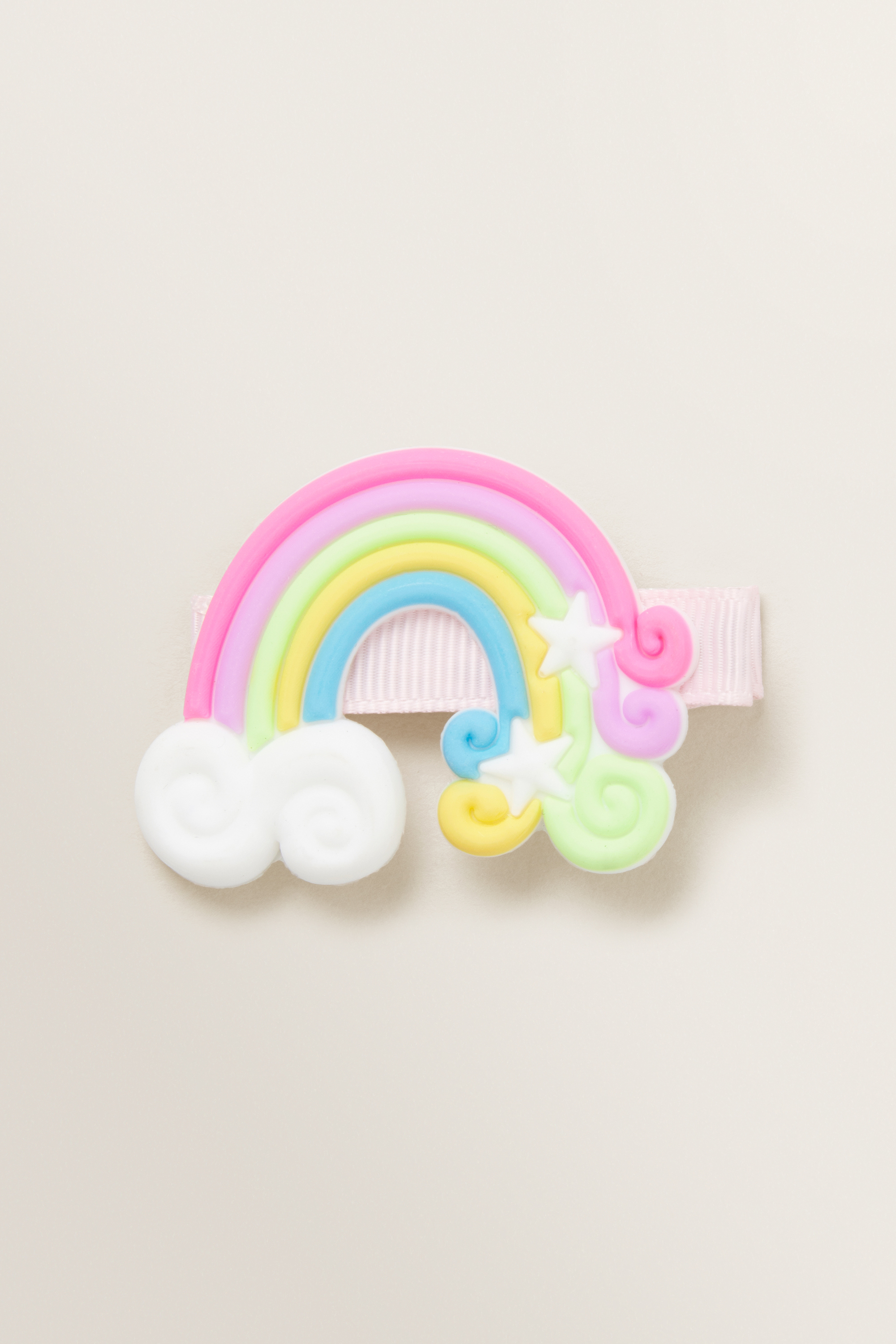 This Rainbow Foam Duck Clip features a grosgrain ribbon base, rainbow motif and secure closure.