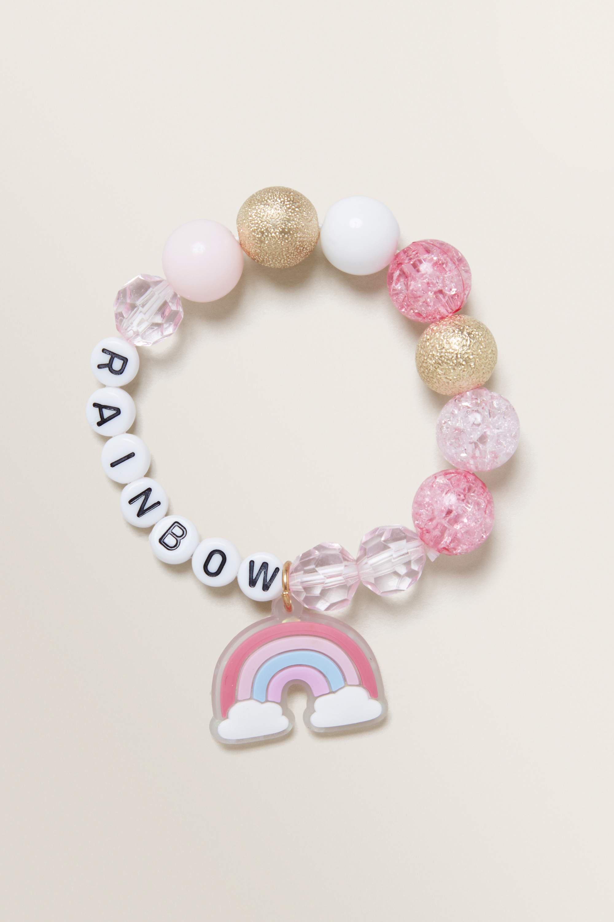 This Unicorn Letter Charm Bracelet features a vibrant beaded bracelet, drop-pendant charms and a stretch base.