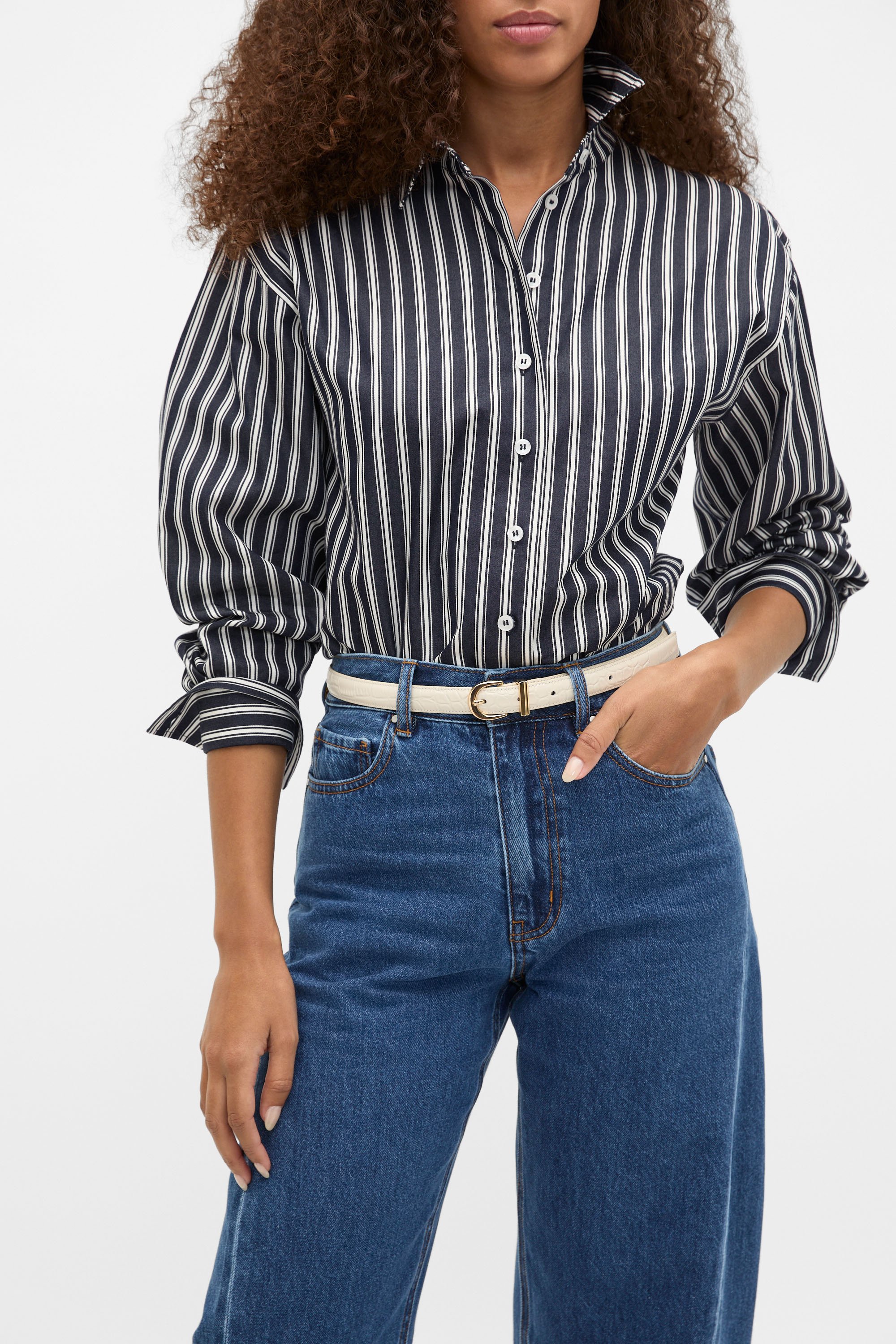 Elegant with a narrow profile, this belt is a chic addition to your wardrobe. Crafted in premium leather, it's detailed with a mock-croc debossed effect and features soft gold hardware with a high shine finish.