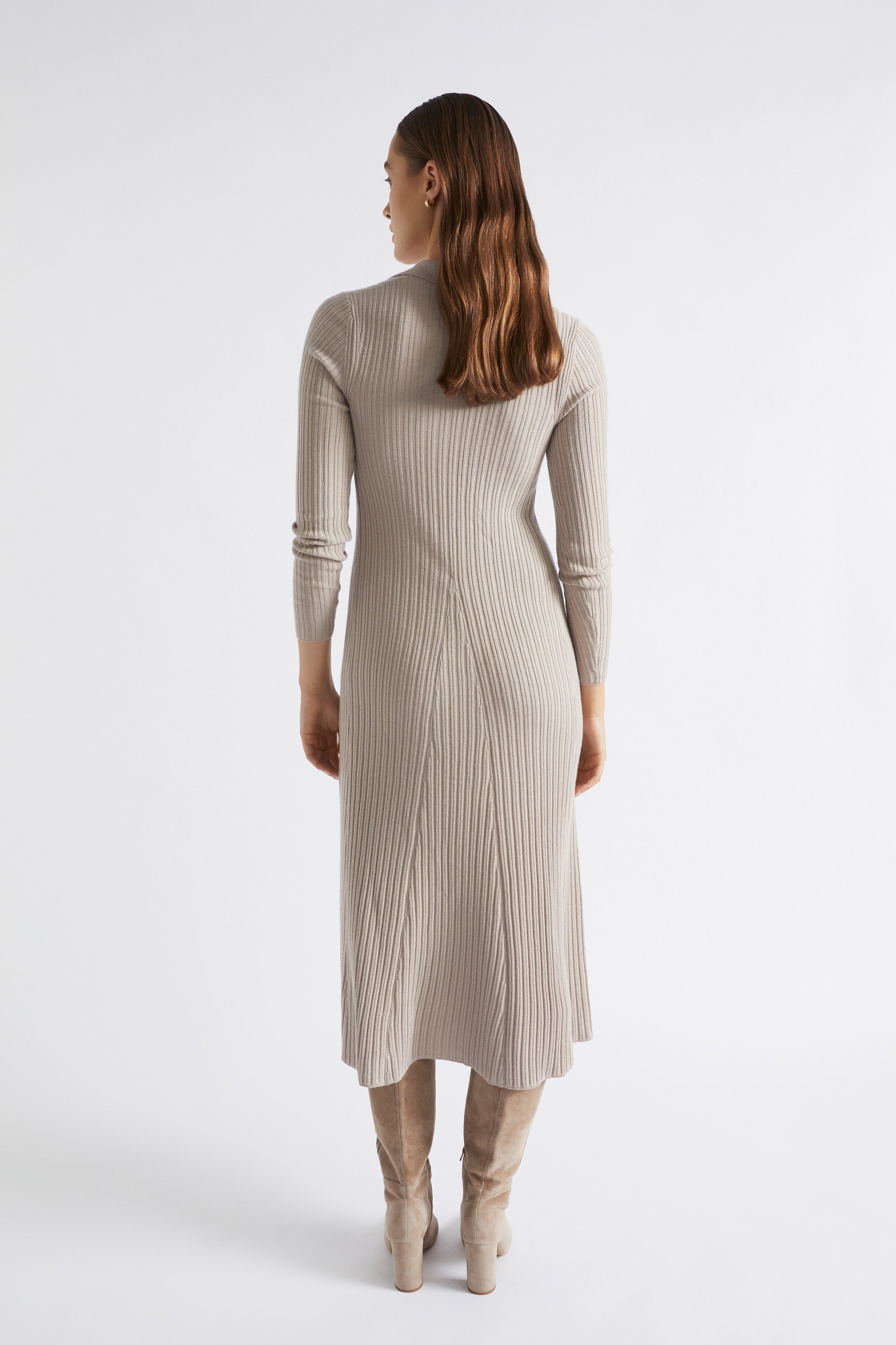 Simple yet striking, this knit dress is sure to be a hit. It features a polo collar and long sleeves, falling in panels to a midi length. The dress is crafted from a stretch blend with cotton and wool.