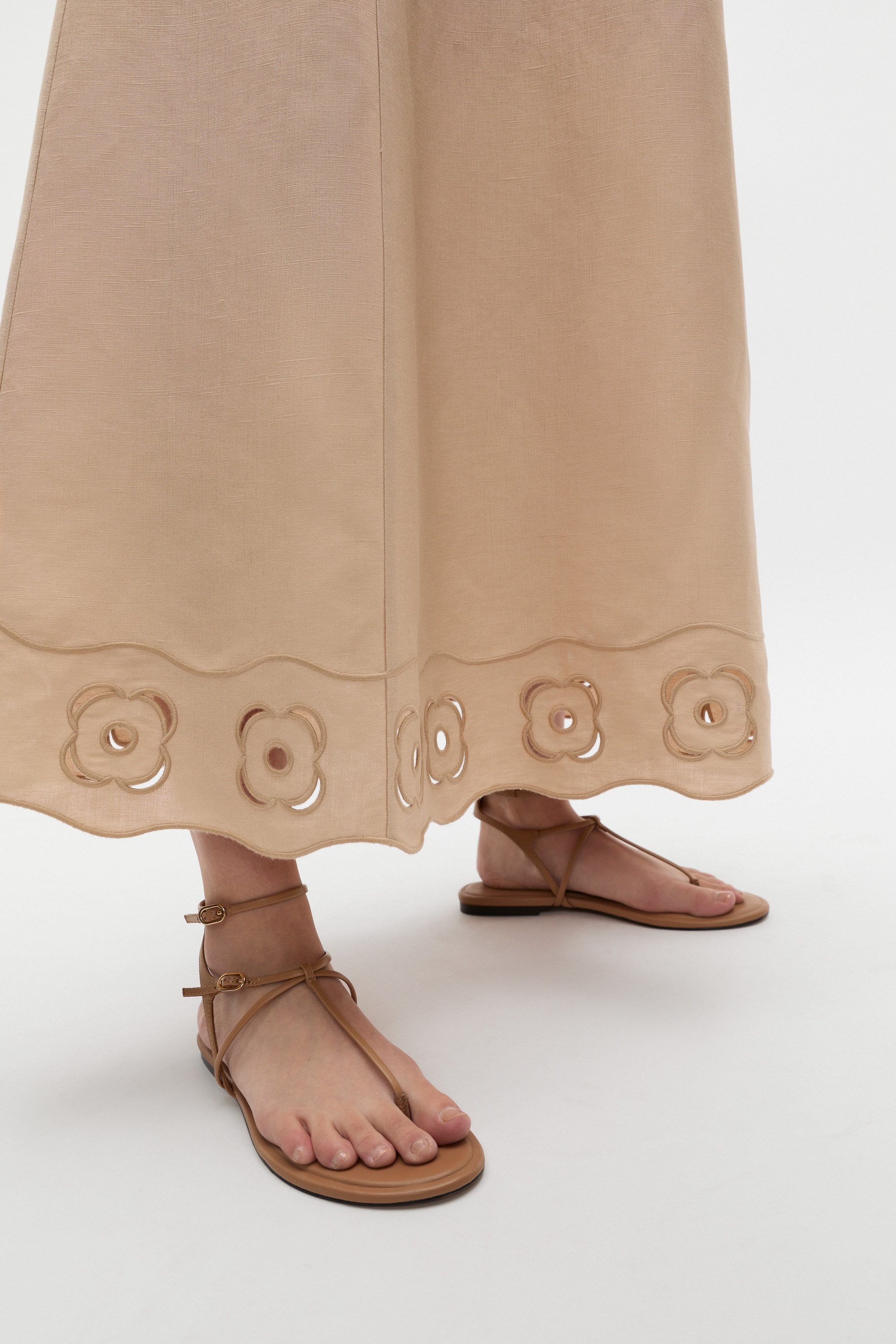 Your new go-to for weekend events, this dress is a classic design elevated with embroidered details. Crafted in a lightweight blend containing linen, it features a square neckline with thick straps and falls to a midi length in an A line shape. It features a floral cutwork design at the hem and secures at the back with an invisible zip.