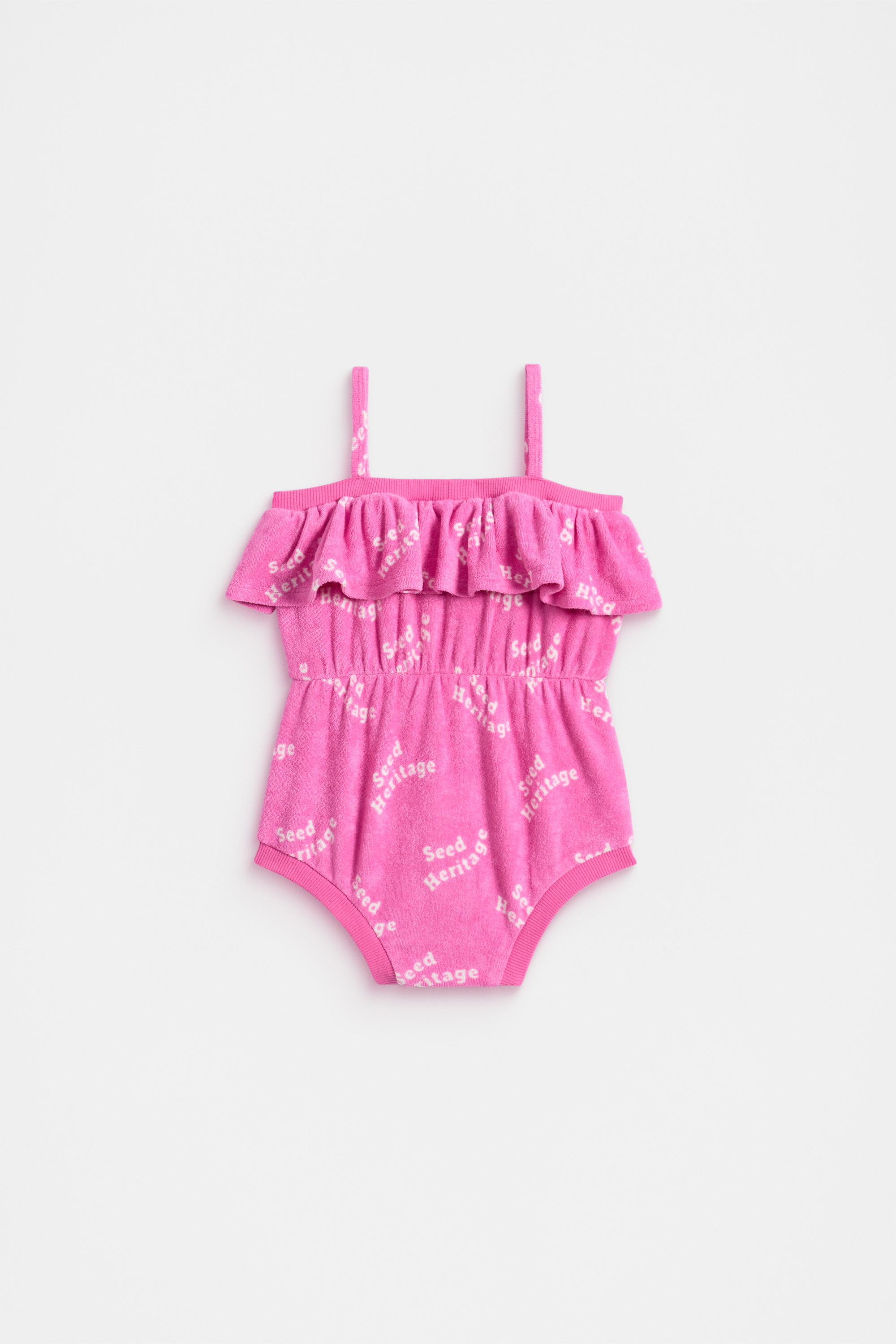 Adorably detailed with a ruffle trim across the neckline, this little romper is perfect for summer. Crafted in a soft textured blend containing cotton, it features slimline straps, a repeating Seed Heritage logo and snaps at the gusset for quick and easy changes.